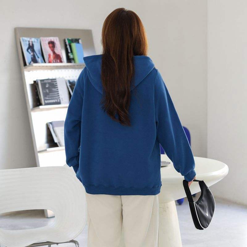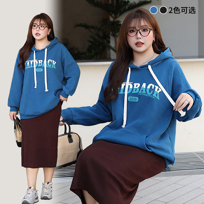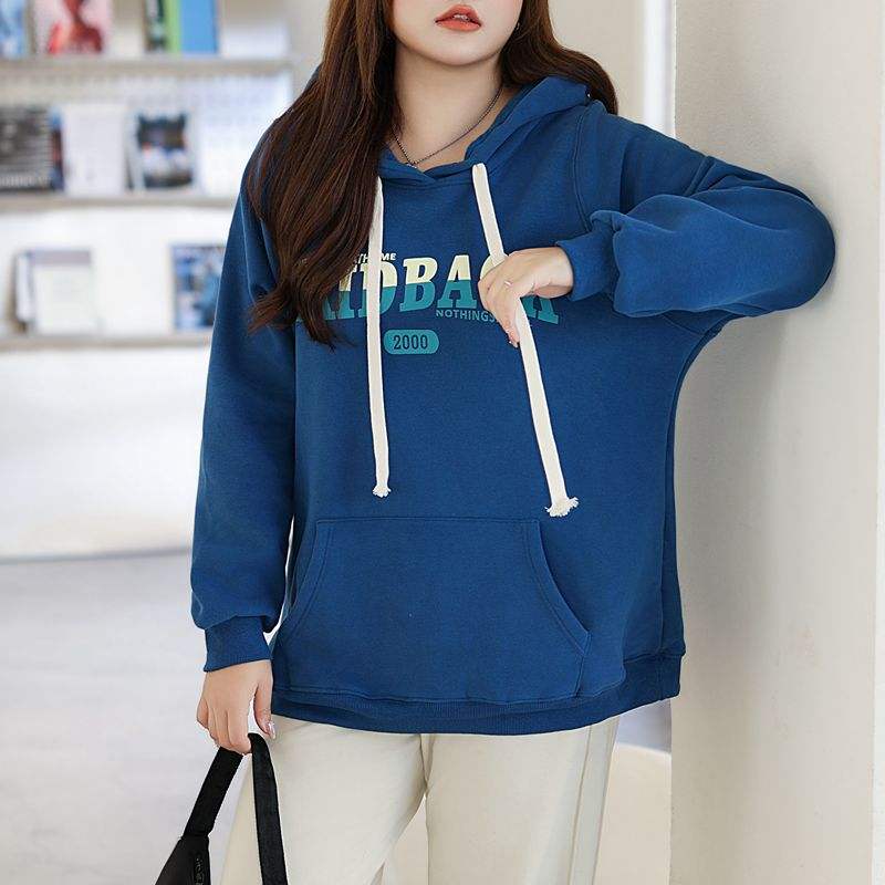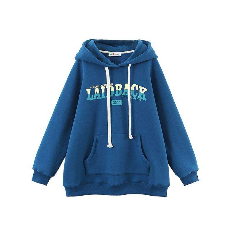 เสื้อสเวตเชิ้ตมีฮู้ดผ้าฟลีซสีน้ำเงินสำหรับผู้หญิงรันฉี ไซส์พลัส พิมพ์ลายลำลอง รุ่น N8596