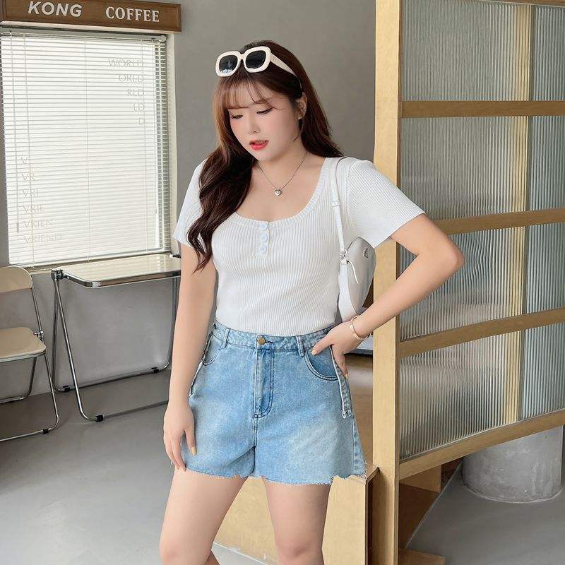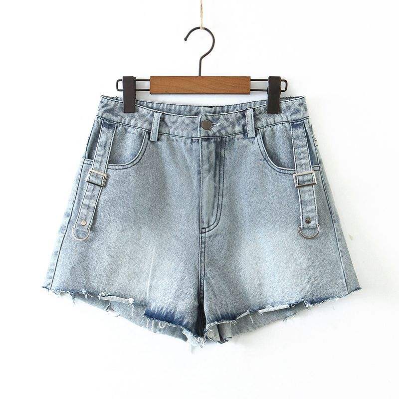 กางเกงยีนส์ขาสั้นผู้หญิงรุ่น N7695 สีน้ำเงิน ขอบรุ่ย เอวสูง มีกระเป๋า ดีไซน์ผ้าฝ้าย ไซส์พลัส
