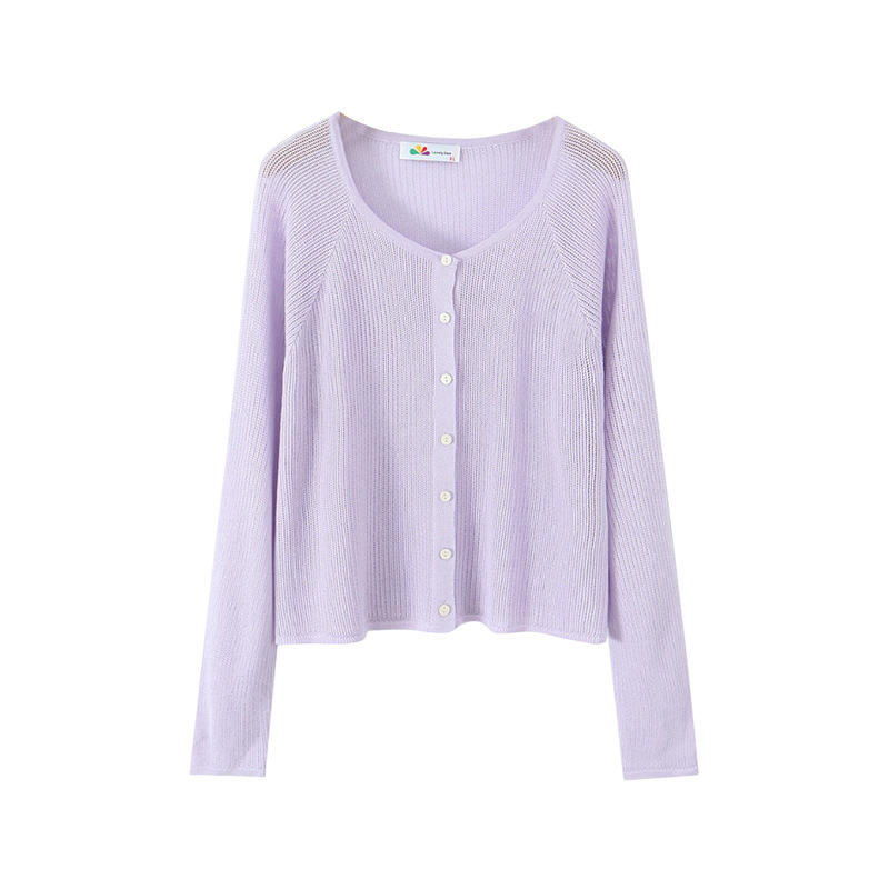 รันฉีเสื้อคาร์ดิแกนถักสีม่วงอ่อนสำหรับผู้หญิง แขนยาว ลายโบฮีเมียน ความหนาปานกลาง สีพื้น N9147