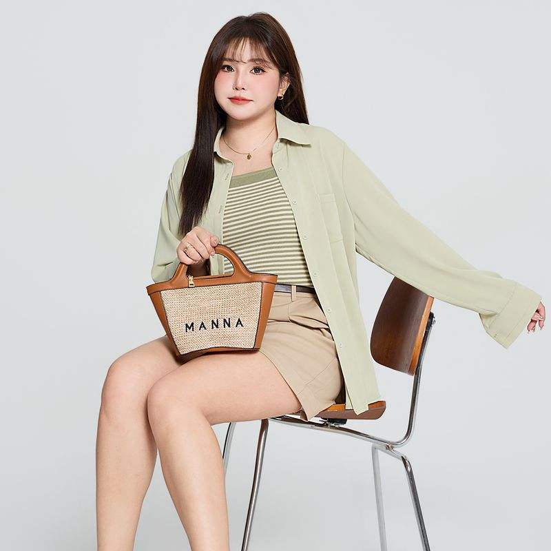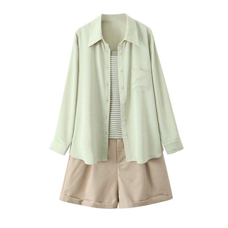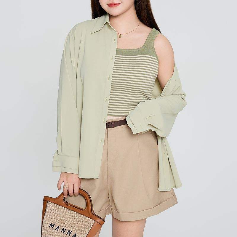 ชุดเสื้อเชิ้ตออกซ์ฟอร์ดสีเขียวมิ้นท์สำหรับผู้หญิง แบรนด์ Runqi แขนยาว ระบายอากาศได้ดี ชุดลำลองสามชิ้น ไซส์พลัส เสื้อลายทางสีเขียวถั่ว