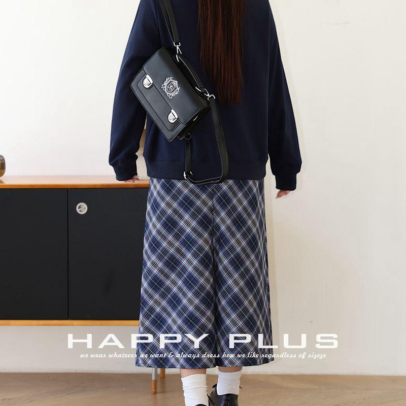 เสื้อสเวตเตอร์คอกลมสีน้ำเงินกรมท่าและกระโปรงลายสก๊อตสีน้ำเงินสี