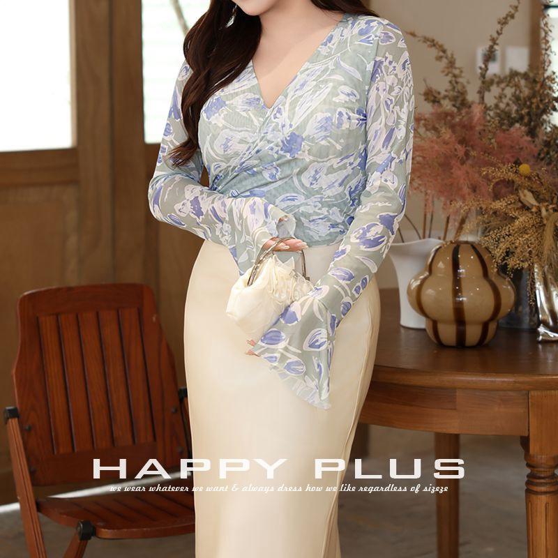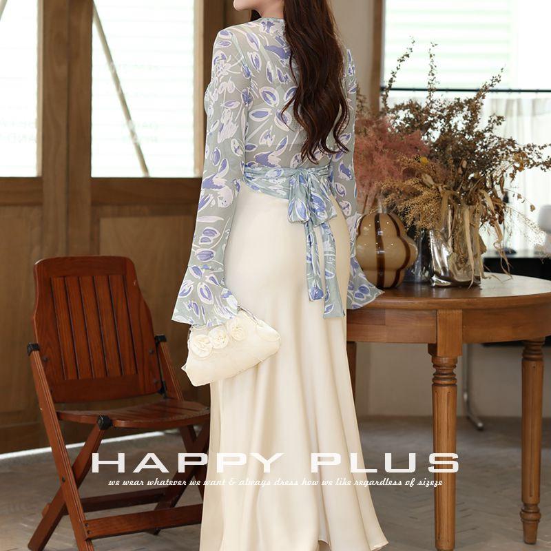 รันฉีเสื้อชีฟองลายดอกไม้สำหรับผู้หญิงไซส์ใหญ่ แขนยาว คอวี ลายพิมพ์นามธรรม ผูกด้านหน้า รุ่น N8966