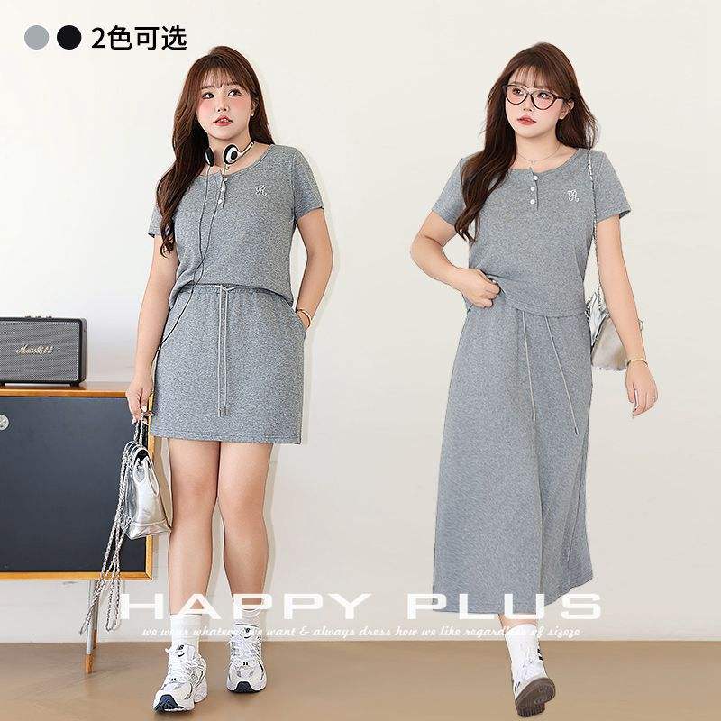 ชุดเสื้อแขนสั้นและกระโปรงยาวระดับกลางสำหรับผู้หญิง รุ่น Runqi สีพื้น ผ้าถัก ระบายอากาศได้ดี ไซส์พลัส ชุดลำลอง