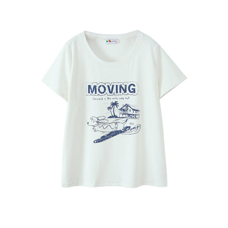 เสื้อยืดแขนสั้นคอกลมพิมพ์ลายสุนัขสำหรับผู้หญิง Runqi สีขาวฟ้าอ่อน ผ้าเจอร์ซีย์ระบายอากาศได้ดี ไซส์พลัส