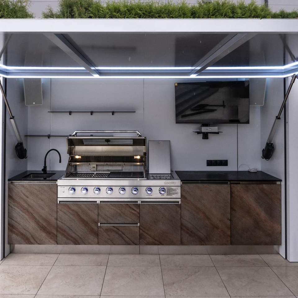 สนิมทำจากจีน304ครัวกลางแจ้งสแตนเลสกันแสงแดดพร้อมเตาย่างในตัวสำหรับสวนวิลล่า