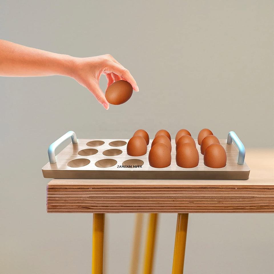 ที่ใส่ไข่ไม้อะคาเซียแบบชนบทพร้อมด้ามจับเหล็กถาดไม้แฮนด์เมดสำหรับเก็บและแสดงไข่ในห้องครัวหรือรับประทานอาหาร