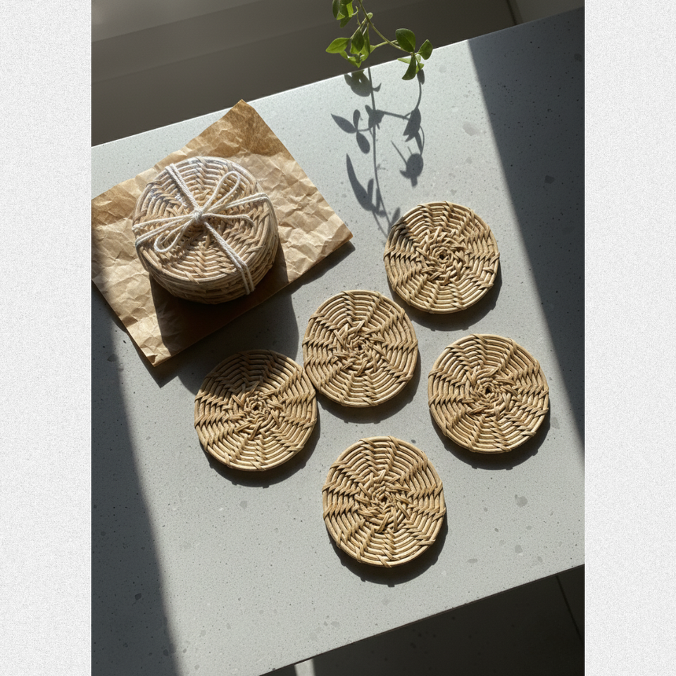 แผ่นรองแก้วหวายทำมือสไตล์ชนบท ขนาด 4 นิ้ว ผิวธรรมชาติ ผลิตในอินเดีย กันลื่น เหมาะสำหรับงานแต่งงาน งานเลี้ยง และตกแต่งบ้าน