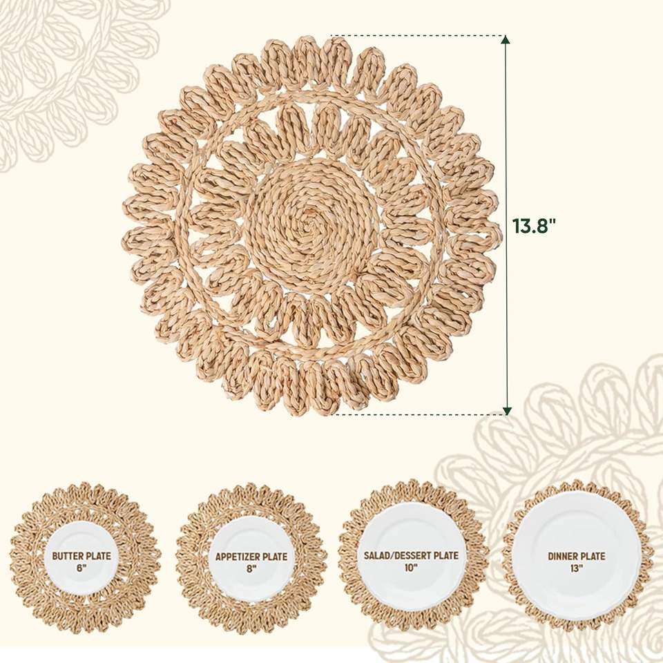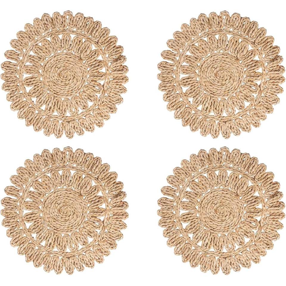 เสื่อหวายทรงกลม4แพ็กแบบชนบทสำหรับใช้ในฟาร์มฟาร์มธรรมชาติแผ่นปูผึ่งข้าวโพดทำด้วยมือทำความสะอาดให้แห้งเท่านั้น