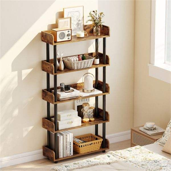 ชั้นวางหนังสือแบบเปิด 5 ชั้น สีน้ำตาลสไตล์เรียบง่าย พร้อมขาตั้งยกสูง ป้องกันการล้ม เหมาะสำหรับใช้ในบ้านหรือสำนักงาน