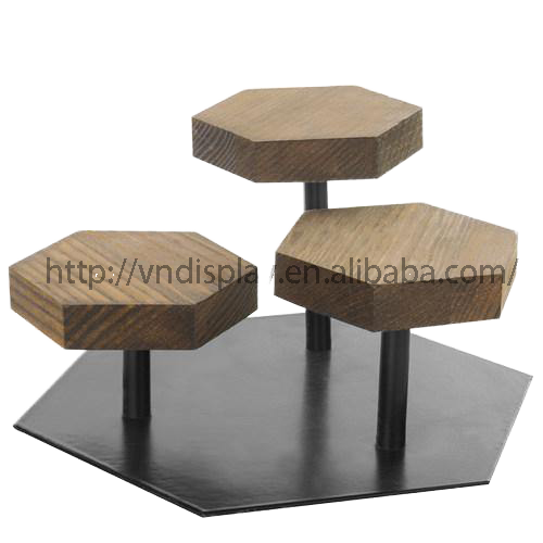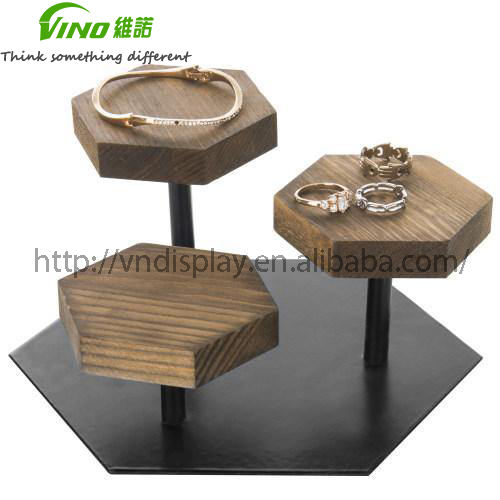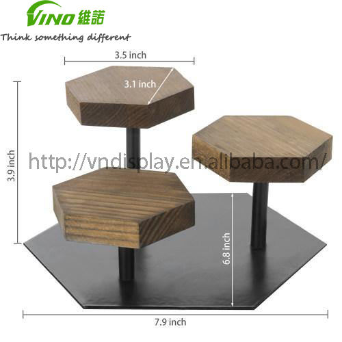 ที่วางแสดงแหวนตั้งโชว์ทรงหกเหลี่ยมทำจากไม้สีน้ำตาลแนวชนบทและโลหะสีดำสำหรับจัดเก็บและจัดแสดงเครื่องประดับ