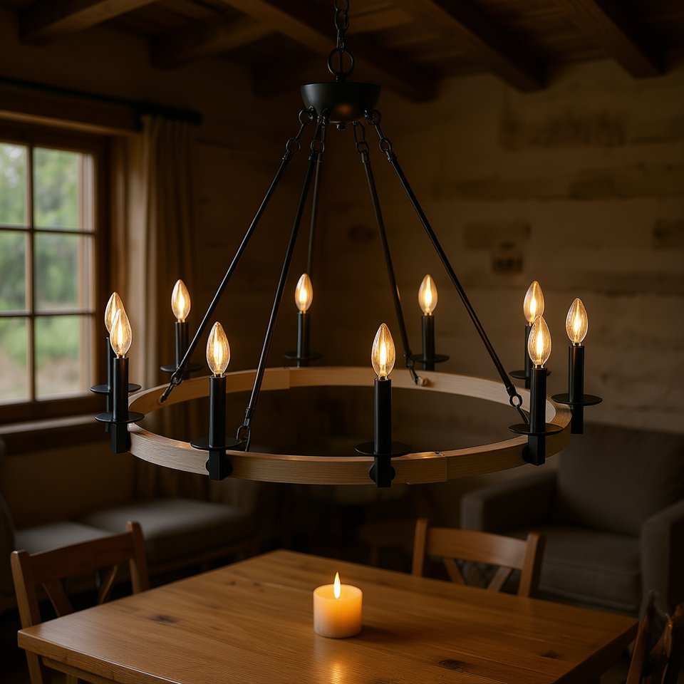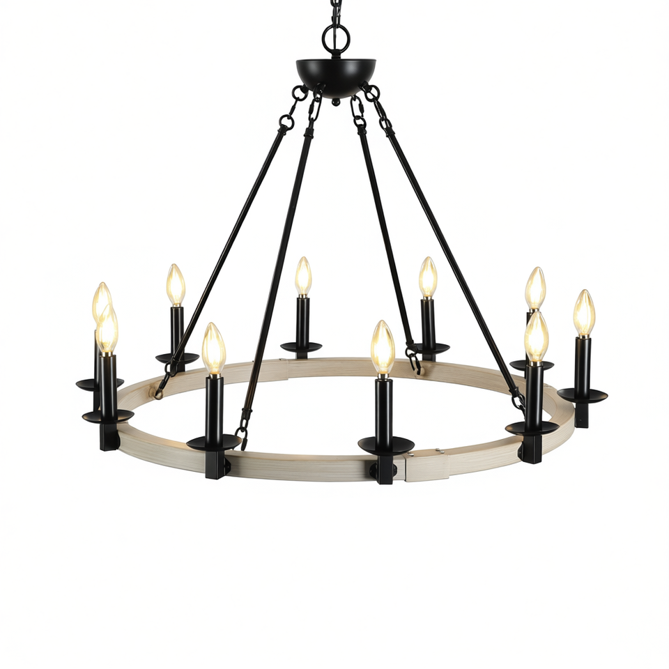 โคมไฟระย้าสไตล์บ้านไร่แบบเรียบง่าย 10 ดวง สีดำด้าน ทำจากโลหะและไม้ ทรงกลม ปรับความสูงได้ ใช้หลอดไฟ E12