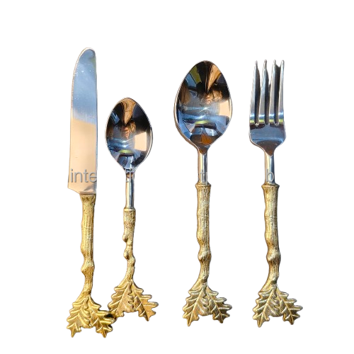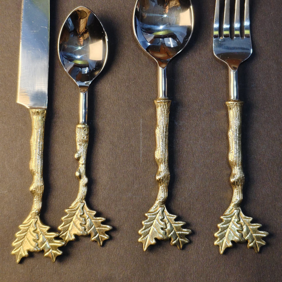 ชุดช้อนส้อมมีดสแตนเลสลายใบไม้โอ๊คสีทองแบบเรียบง่าย ด้ามจับทองเหลือง ดีไซน์ธีมป่า สำหรับตกแต่งงานปาร์ตี้ เป็นมิตรกับสิ่งแวดล้อม