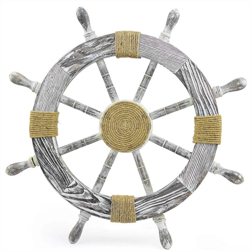 ล้อเรือไม้คลาสสิกแนววินเทจสีเทาแบบเรียบง่ายพร้อมสมอและเชือกบ้านชายหาดมหาสมุทร