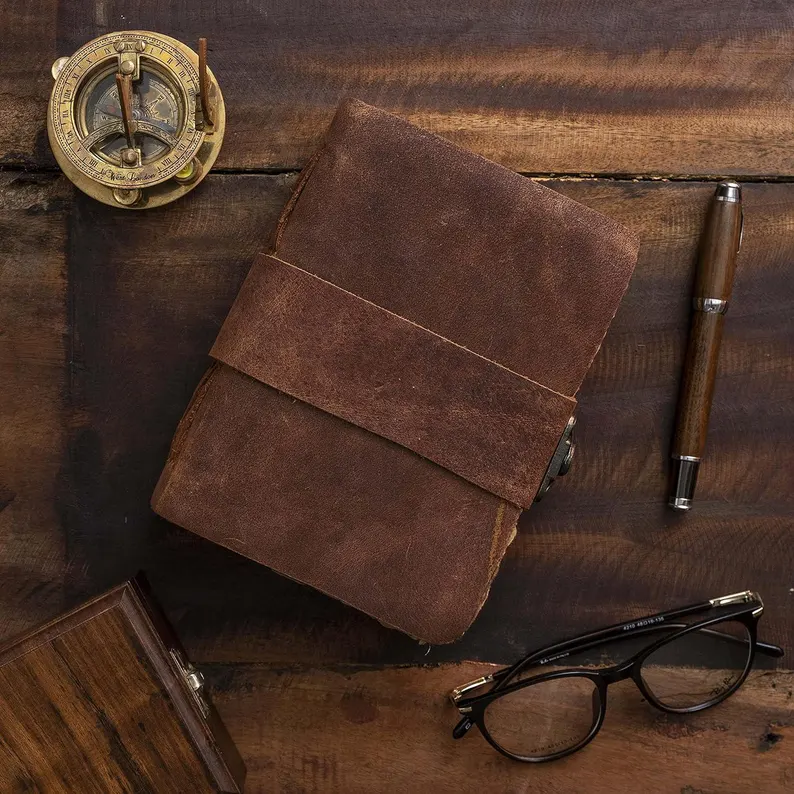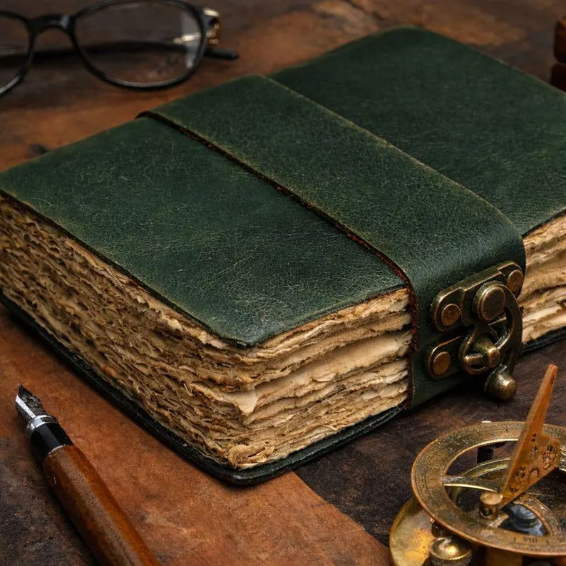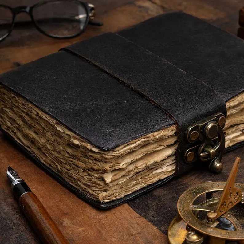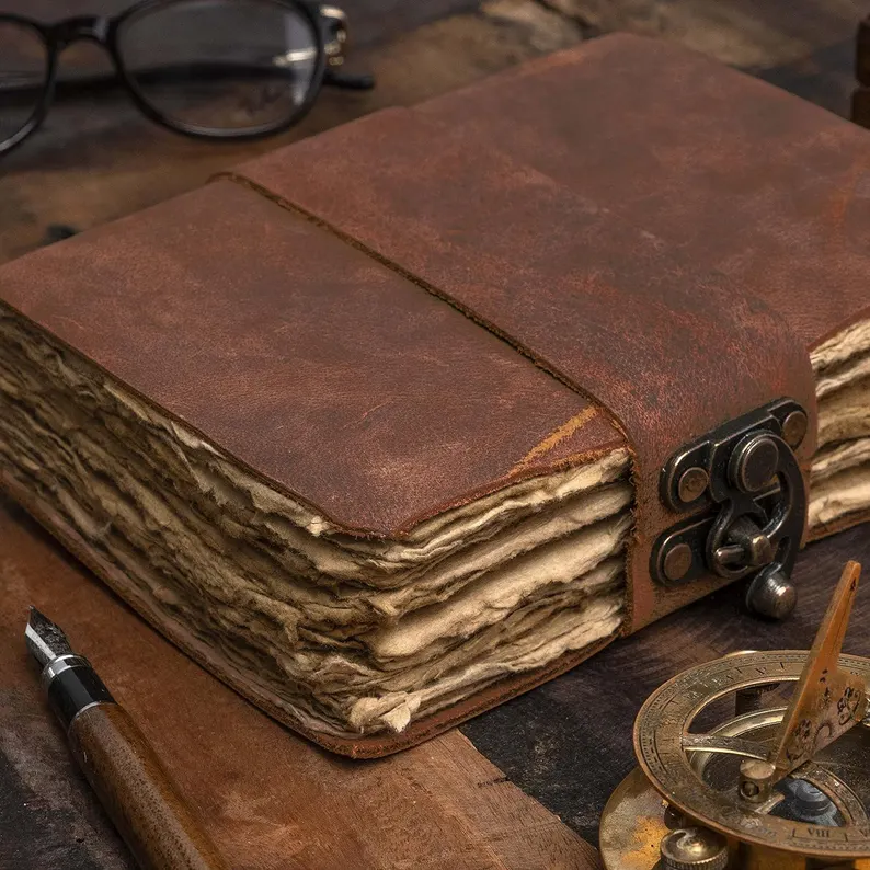 สมุดบันทึกหนังทำมือสไตล์เรียบง่าย พร้อมตัวล็อคแบบโบราณ กระดาษขอบฉีกแบบวินเทจ สมุดบันทึกงานฝีมือ ของขวัญสำหรับนักเขียน