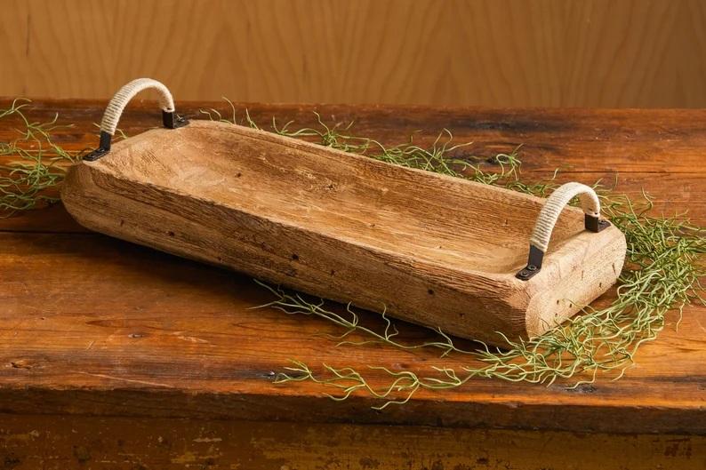 ถาดเก็บของและเสิร์ฟอาหารสไตล์เรียบง่ายพร้อมหูจับเชือกแข็งแรง ดีไซน์งานฝีมือ เหมาะสำหรับตกแต่งโต๊ะและงานเลี้ยงสังสรรค์