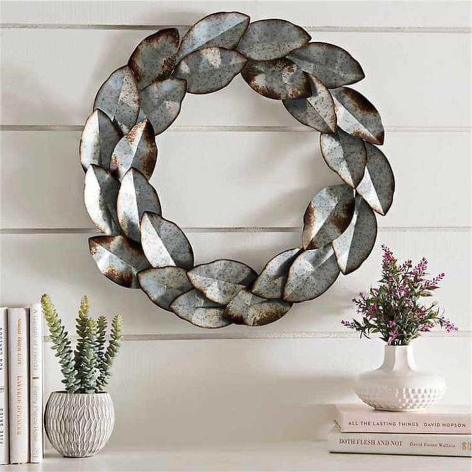 พวงหรีดใบไม้โลหะสไตล์เรสติก ตกแต่งบ้าน สีเงินโบราณ ใบเหล็กทำสีซีด ประดับแขวนสำหรับงานแต่งงาน งานปาร์ตี้