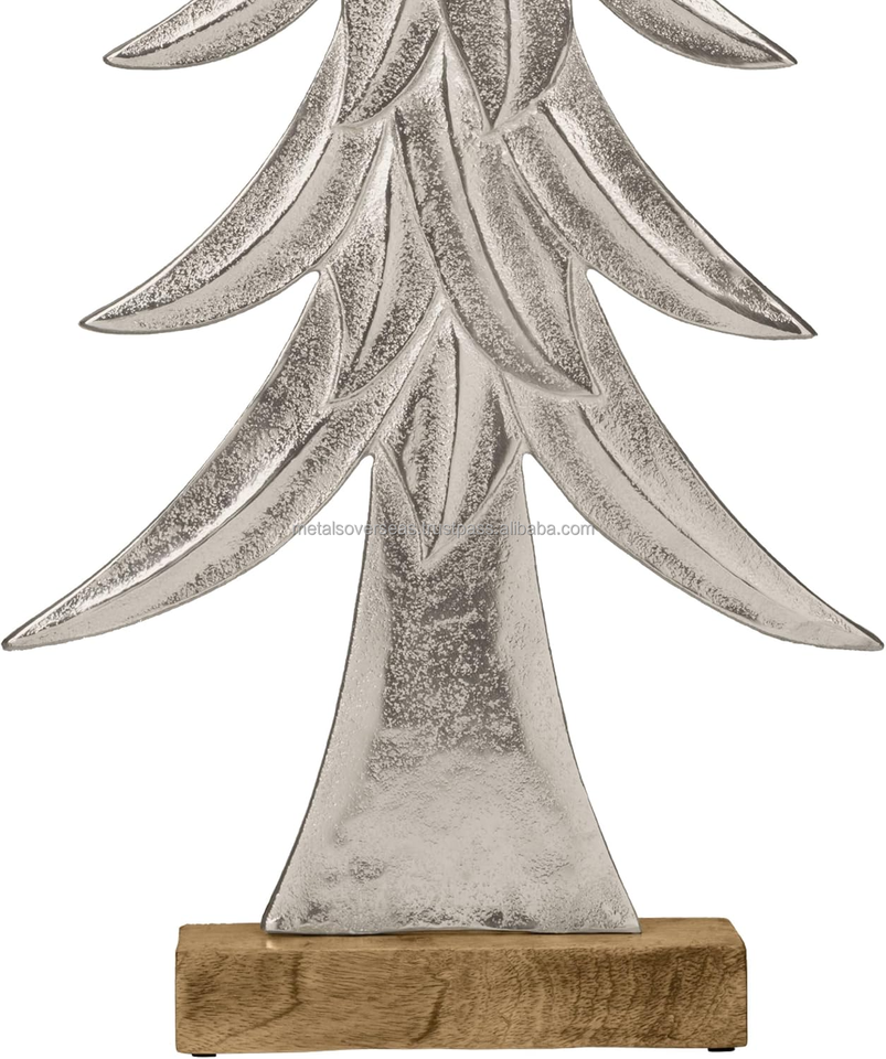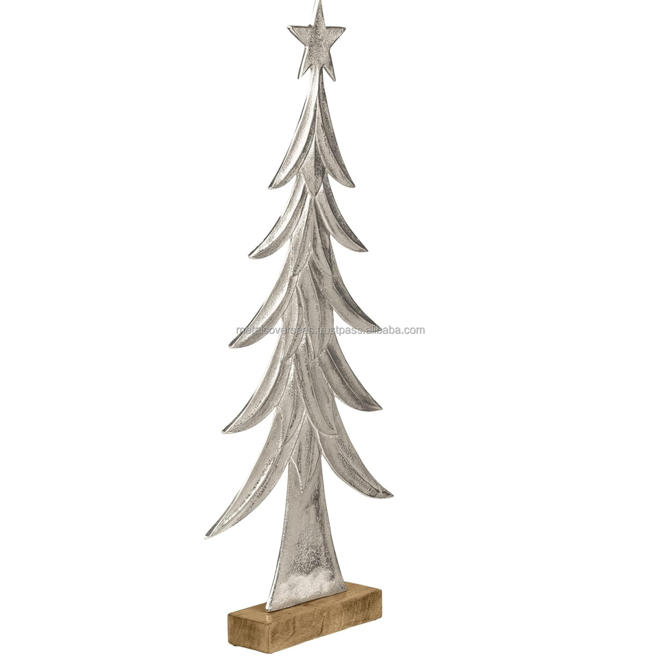 ต้นคริสต์มาสโลหะอะลูมิเนียมสีเงินทันสมัย พร้อมดาวประดับด้านบน ฐานไม้ ปรับแต่งได้ ผลิตจากโรงงานโดยตรง สวยงาม เหมาะสำหรับวางบนโต๊ะ