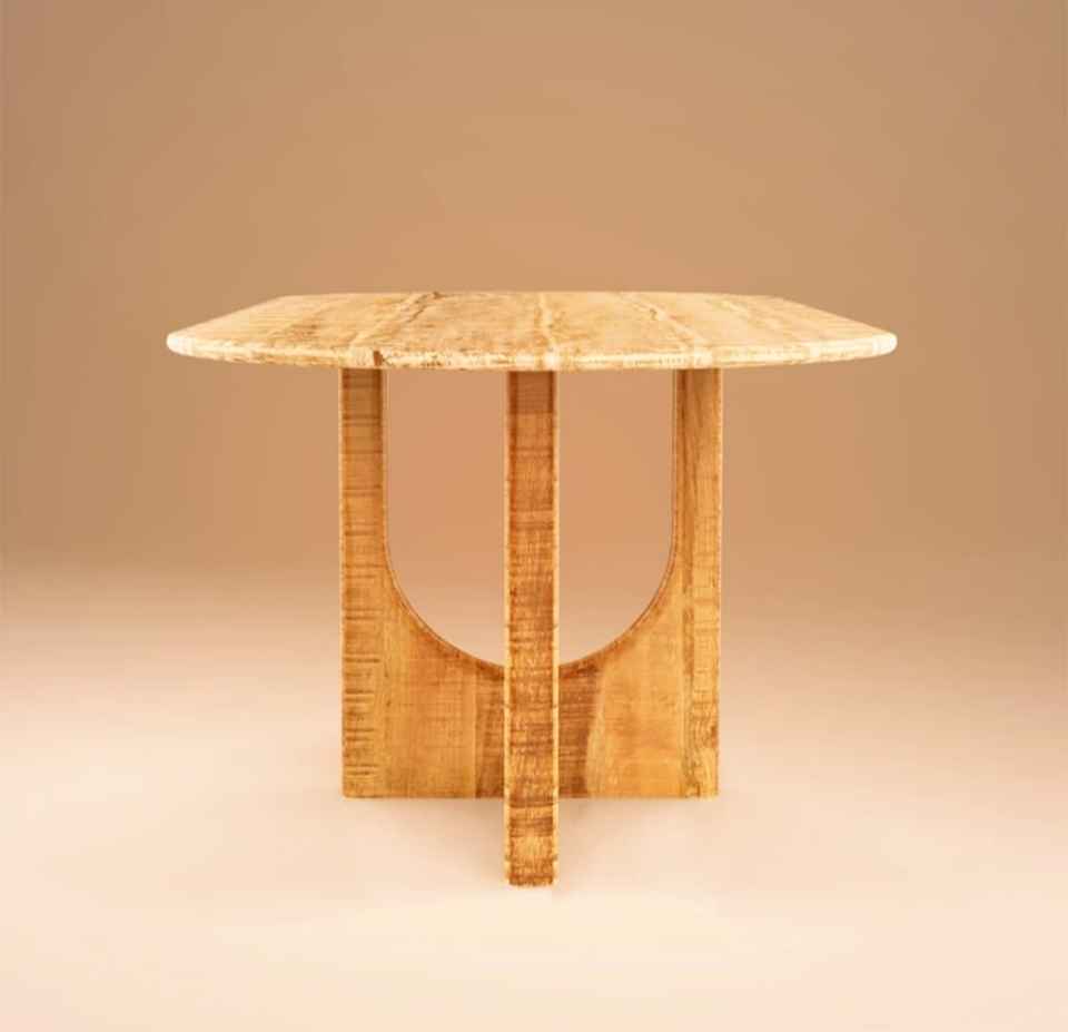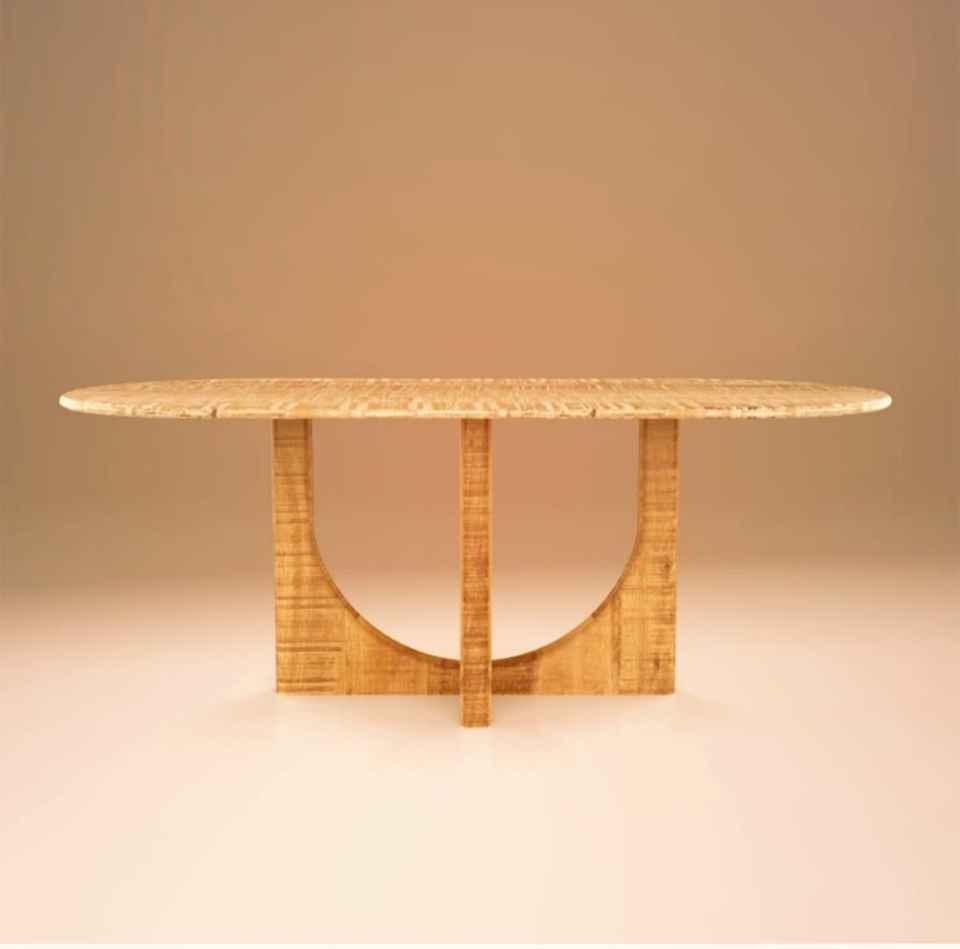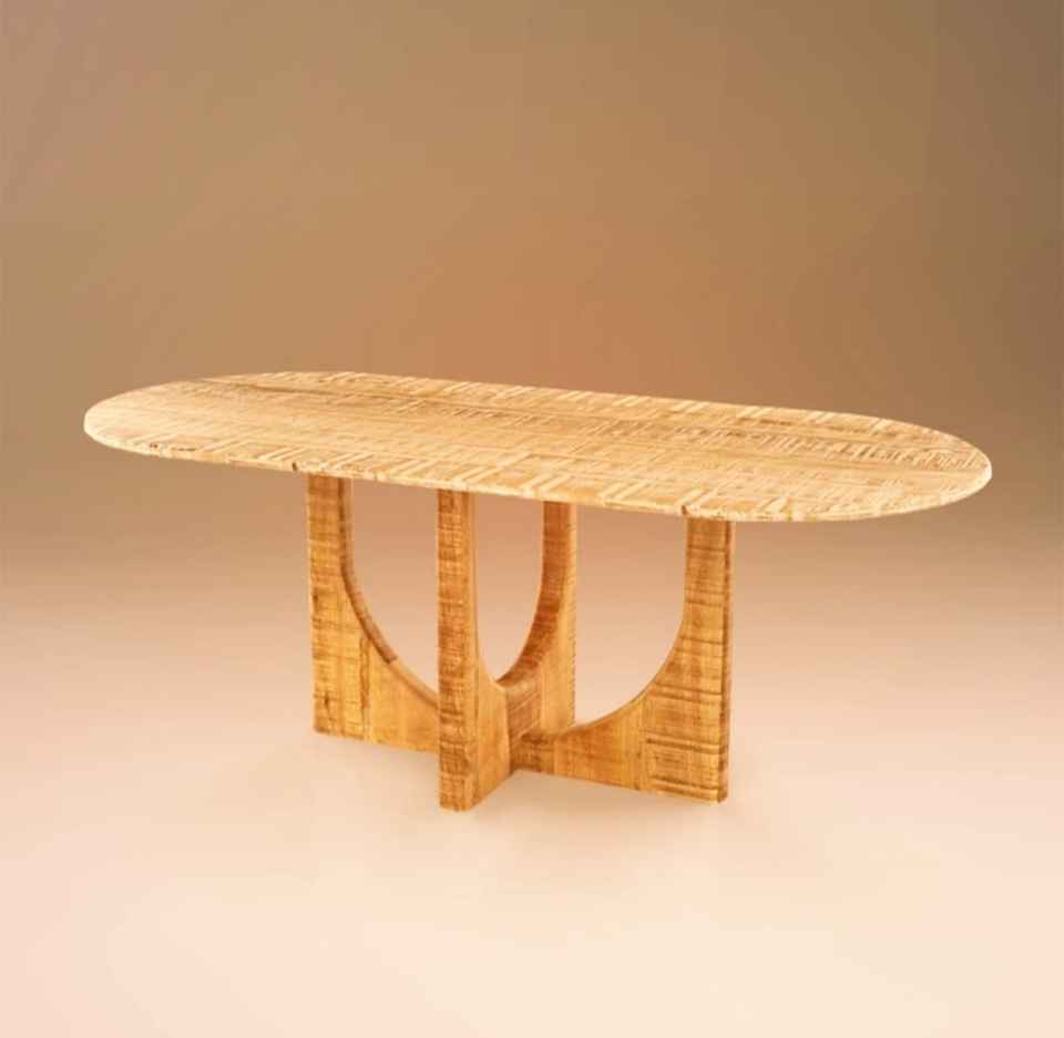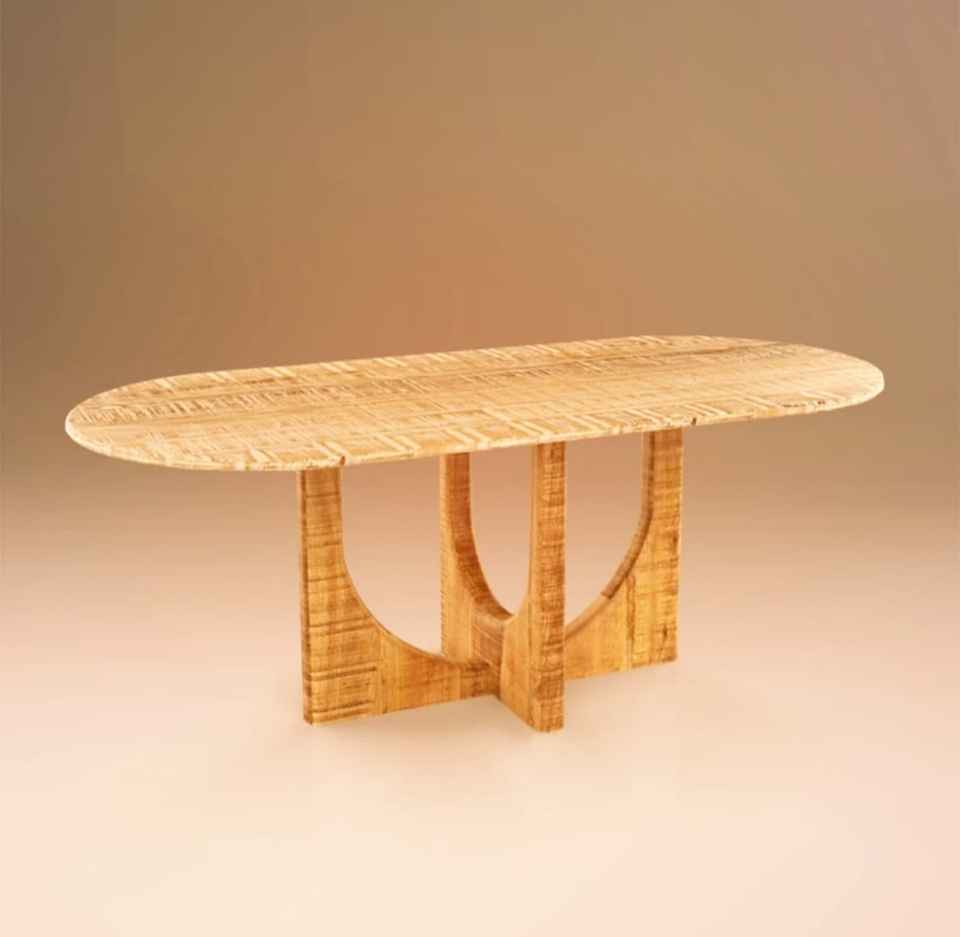 โต๊ะรับประทานอาหารไม้มะม่วงรูปไข่แบบชนบทพร้อมฐานรองรับโค้งที่เป็นเอกลักษณ์สำหรับร้านอาหารและร้านกาแฟ