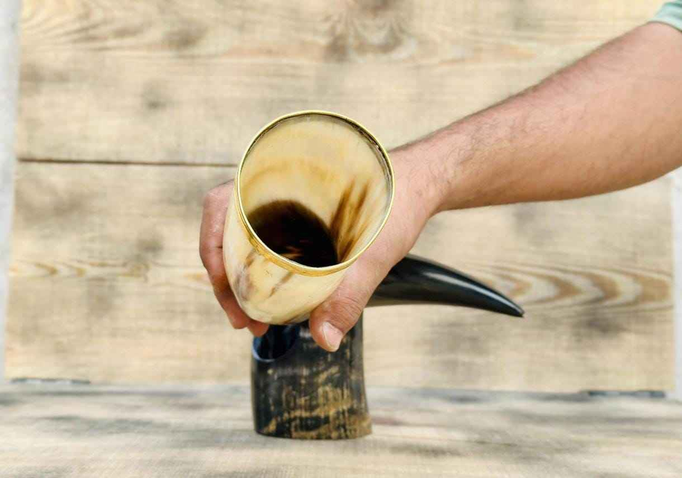 ชุดเขาสัตว์สำหรับดื่มสไตล์ไวกิ้งขัดเงาแบบเรียบง่าย พร้อมขาตั้งโลหะสีเงิน เป็นมิตรกับสิ่งแวดล้อม ทำจากเขาสัตว์ธรรมชาติ ทำด้วยมือ ทนทาน เหมาะสำหรับงานแต่งงาน ตกแต่งบ้าน รับสั่งทำ