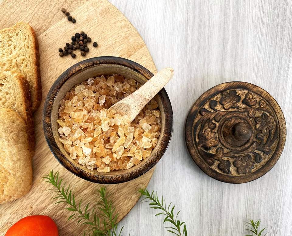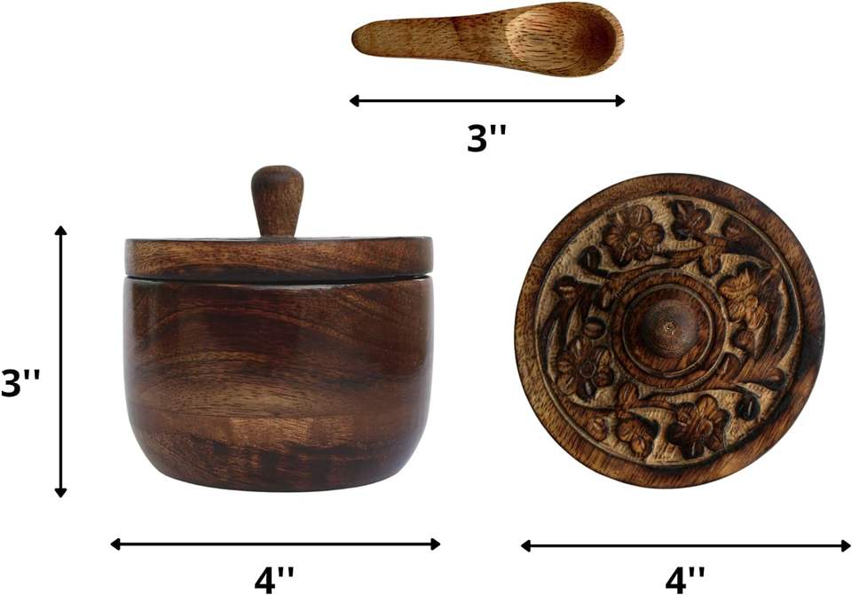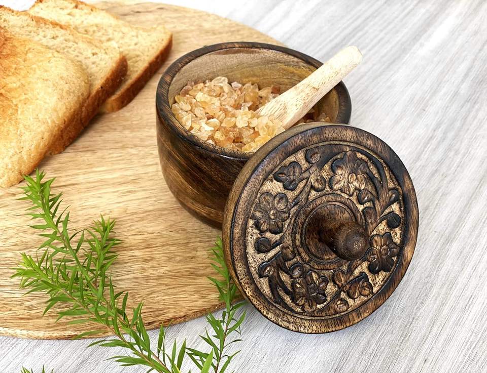 กระปุกเกลือแบบชนบทพร้อมฝาปิดแกะสลักด้วยมือและช้อนเกลือชามใส่เครื่องเทศสำหรับทำอาหารเกลือ
