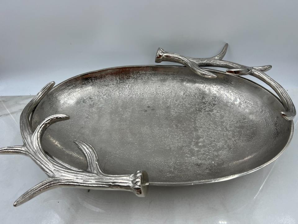 แผ่นเสียงรูปไข่สีเงินแบบชนบทพร้อมด้ามจับเขากวางถาดเสิร์ฟสไตล์ลอดจ์