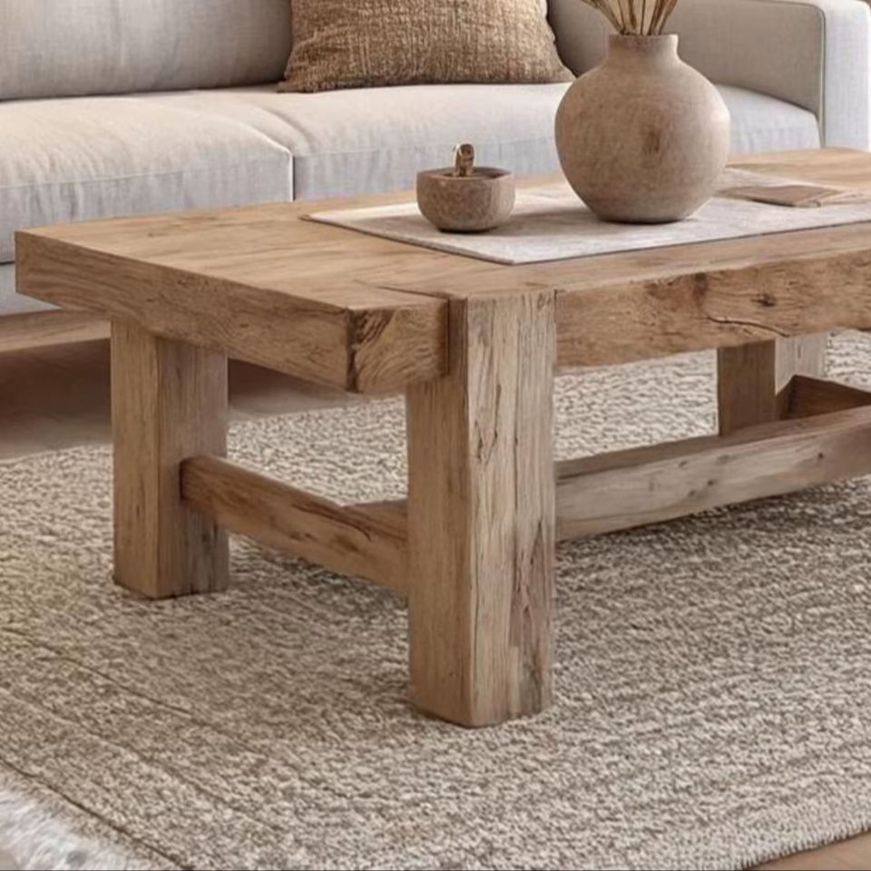 โต๊ะกาแฟไม้เนื้อแข็งสไตล์เรียบง่าย หน้าโต๊ะทรงสี่เหลี่ยมหนา โครงฐานรองรับแข็งแรง พร้อมผิวไม้ธรรมชาติ สำหรับห้องนั่งเล่น