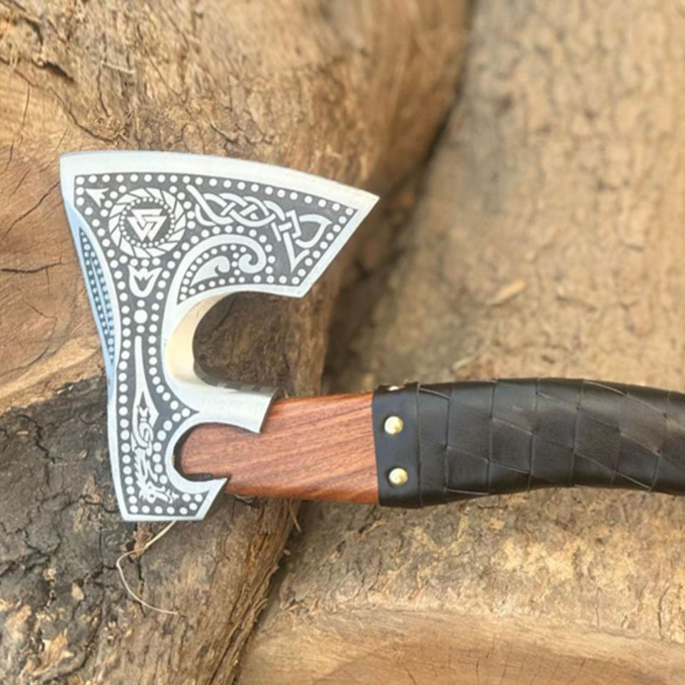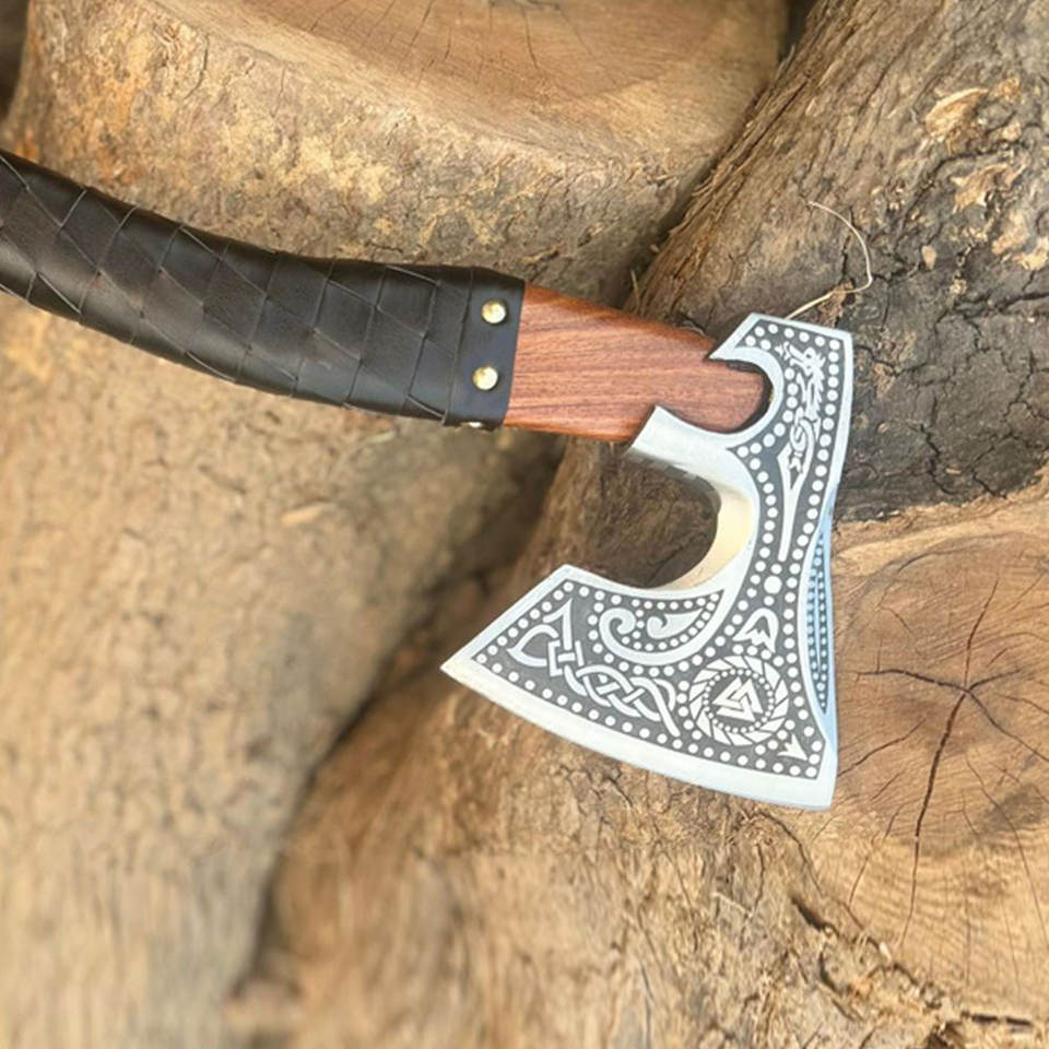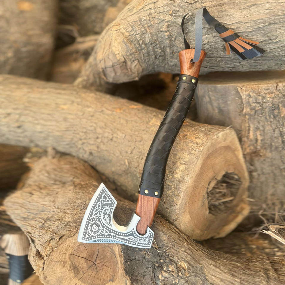 ขวานไวกิ้งสไตล์เรียบง่ายแบบอุตสาหกรรม หัวเหล็กทำมือ ด้ามไม้ธรรมชาติ หุ้มด้วยหนัง แรงบันดาลใจจากวัฒนธรรมนอร์ดิก สำหรับกิจกรรมกลางแจ้ง