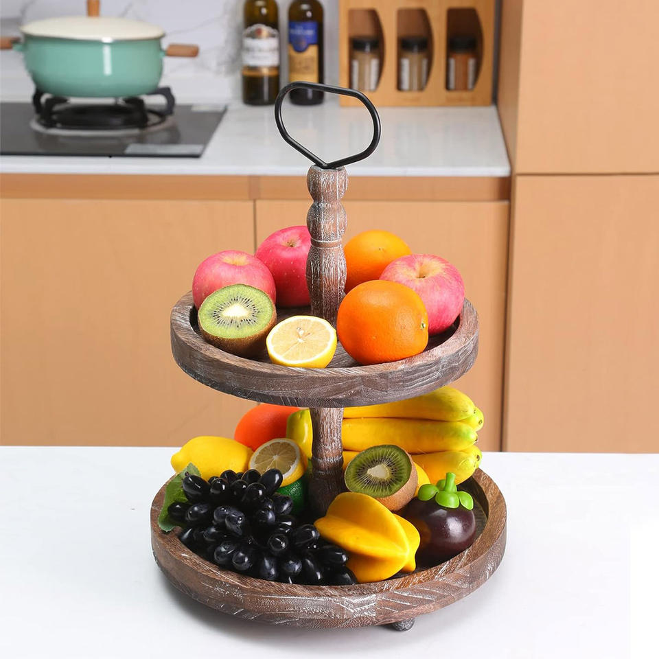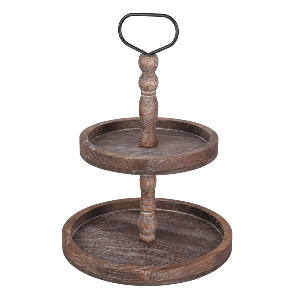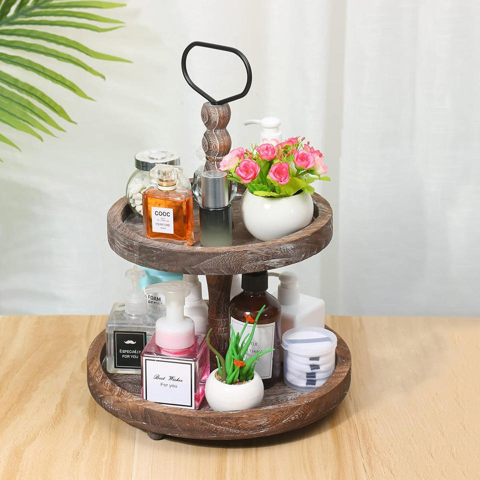 ถาดไม้สองชั้นแบบชนบทถาดไม้ทรงกลม2ชั้นหรูหราสำหรับบ้านไร่ถาดเครื่องประดับไม้สำหรับเค้กกาแฟขนมผลไม้จานสำหรับใช้