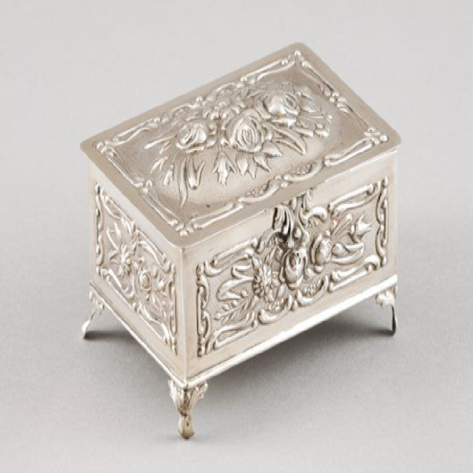 กล่องเครื่องประดับเงินโบราณแบบชนบทนูนด้วยลวดลายดอกไม้ที่สวยงามฐานที่มีเสน่ห์มีจำหน่ายในราคาขายส่ง