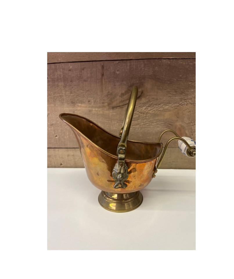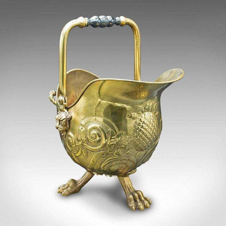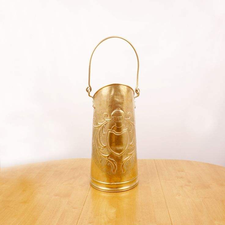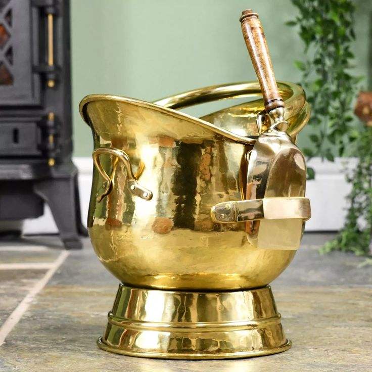 ถังถ่านหินทองเหลืองแบบชนบทที่มีเสียงโบราณและรูปแบบงานฝีมือทำสำหรับเตาผิงในบ้านในช่วงเวลาหรือการตกแต่งแนววินเทจ