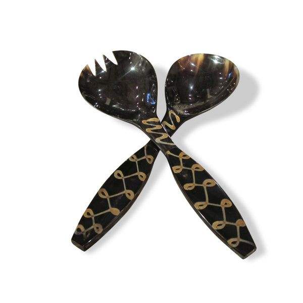 ชุดช้อนเขาควายแบบเรียบง่ายทำจากวัสดุขัดธรรมชาติและพื้นผิวสำเร็จรูปสำหรับเสิร์ฟอาหารออร์แกนิกแบบดั้งเดิม