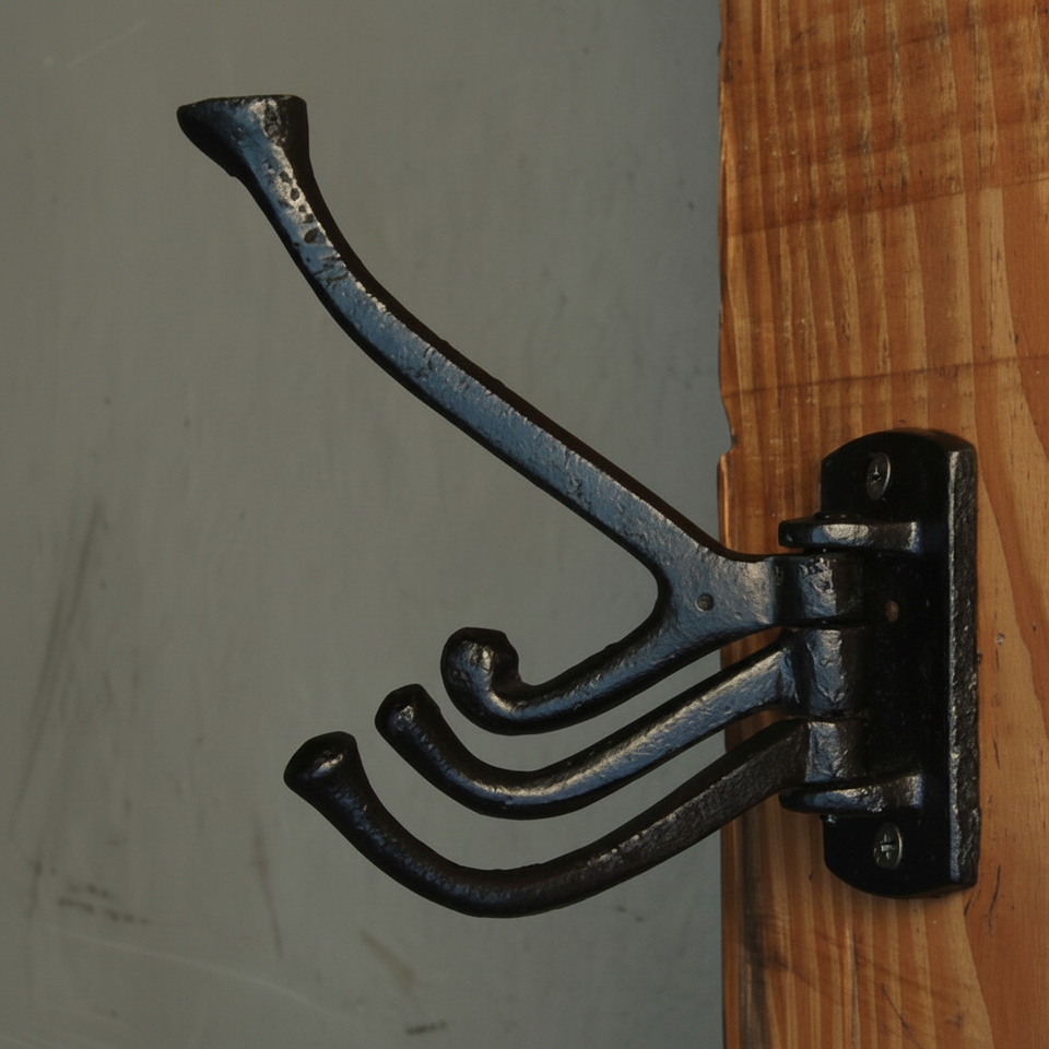 ตะขอแขวนผนังเหล็กหล่อแบบเรียบง่ายมีเส้นโค้งกว้างสำหรับแขวนหมวกกุญแจหรือกระเป๋าในทางเข้าหรือห้องนอนอย่างปลอดภัย