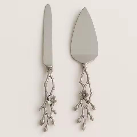 ชุดมีดและเซิร์ฟเวอร์เค้กโลหะแนวชนบทพร้อมที่จับด้ามด้ามด้ามไม้มะกอกแกะสลักเครื่องใช้สำหรับของหวานในงานแต่งงานตามธรรมชาติ
