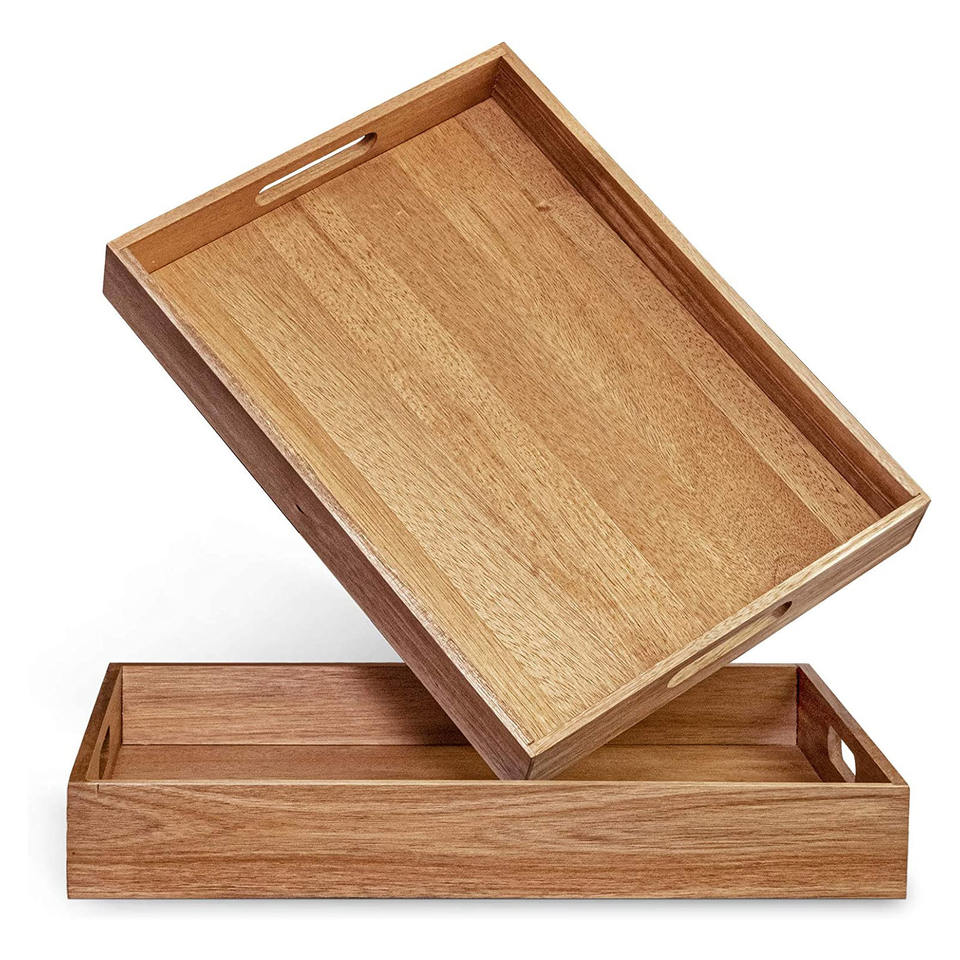 ถาดไม้สี่เหลี่ยมผืนผ้าสำหรับจัดเลี้ยงอาหารจานด่วนทำจากไม้ธรรมชาติแบบเรียบง่ายพร้อมด้ามจับ
