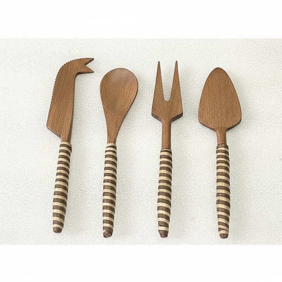 ชุดชีสไม้กระถินเทศสไตล์เรียบง่ายแต่หรูหรา พร้อมด้ามจับหวายสาน ใบมีดสแตนเลส สำหรับเสิร์ฟชีส แยม หรืออาหารเรียกน้ำย่อย
