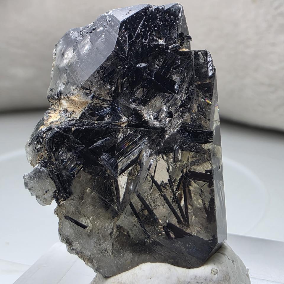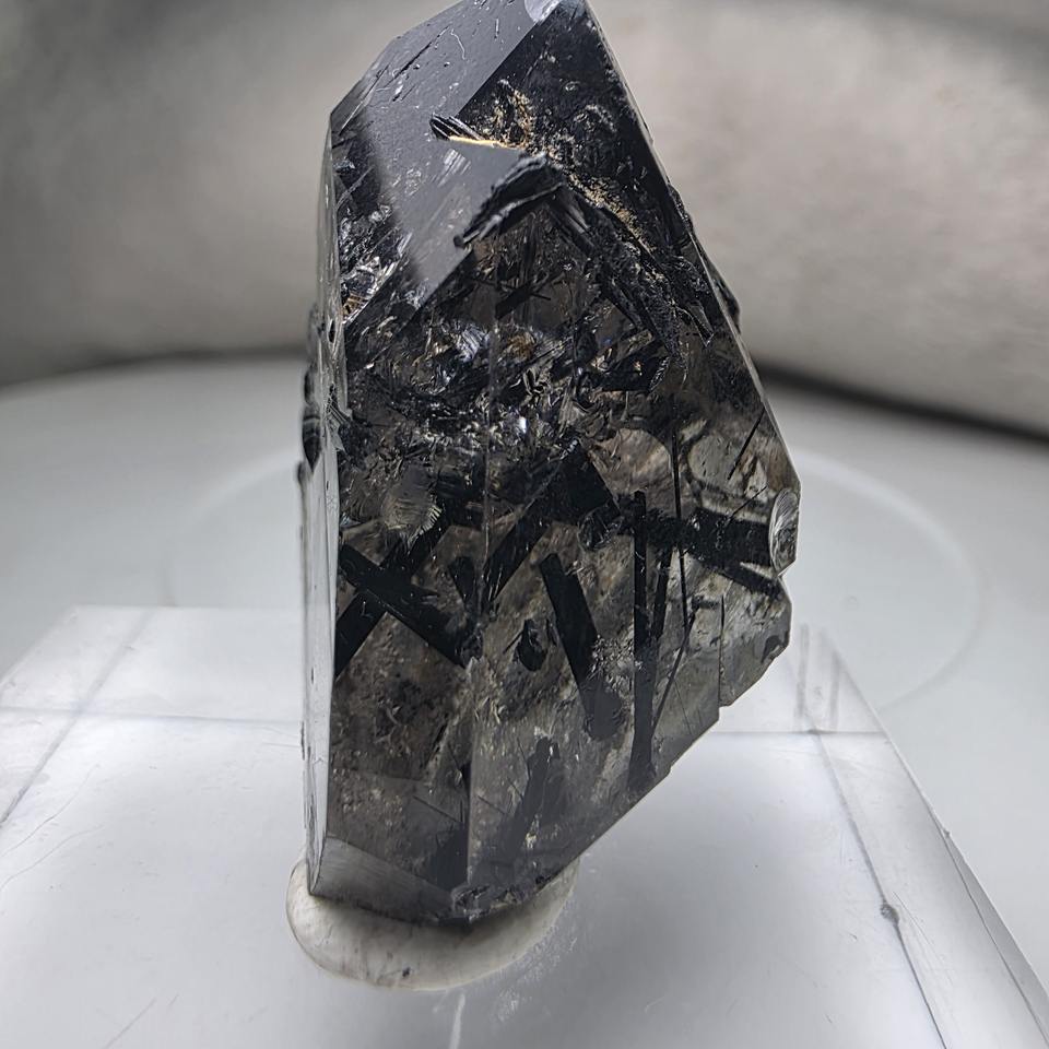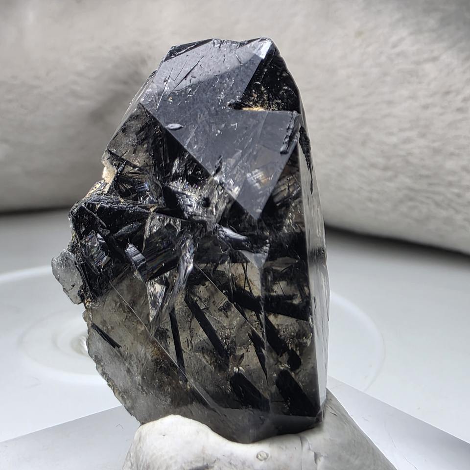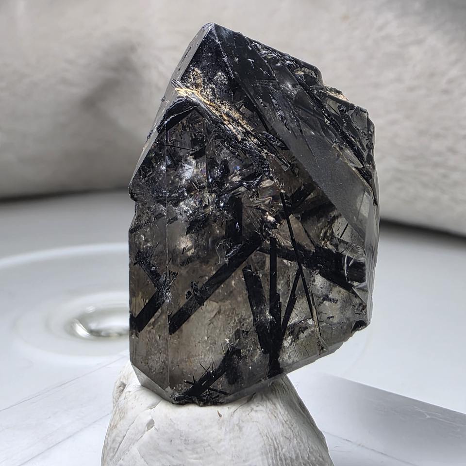 ควอตซ์รูไทล์คริสตัลธรรมชาติ สีดำ มีรูไทล์ในตัว รูปทรงไม่สม่ำเสมอ น้ำหนัก 23 กรัม ตัวอย่างที่ยังไม่ผ่านการปรับแต่ง