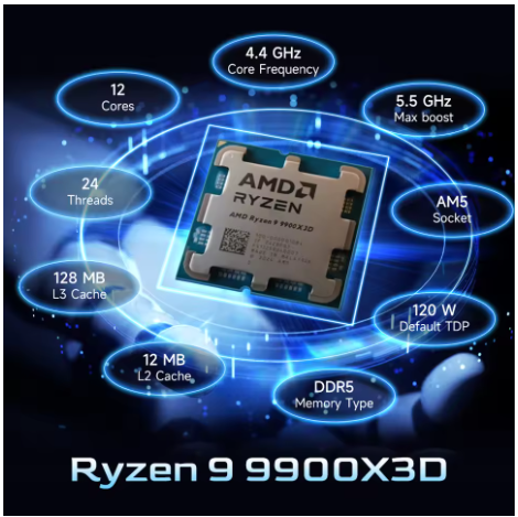 Ryzen 9 9900X3D 12-Core 24-Thread 5.5GHz PCIe 5.0 Socket AM5 DDR5 TDP 120W ซีพียูสำหรับเล่นเกม ใหม่ L3=128MB 100-000001368