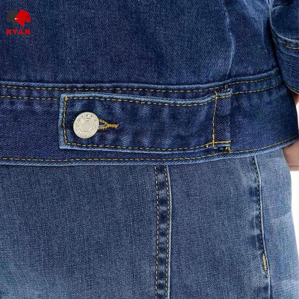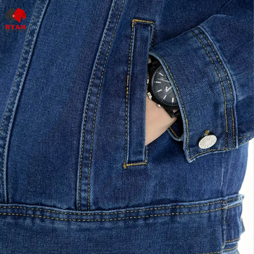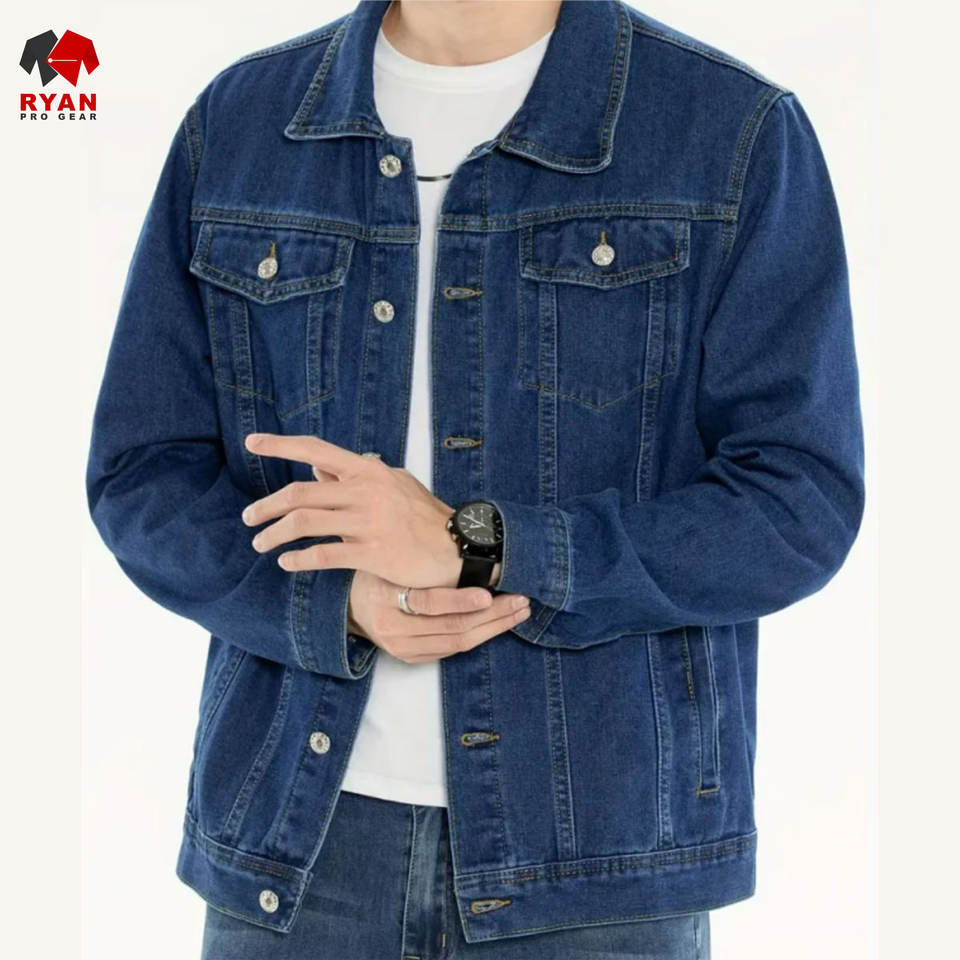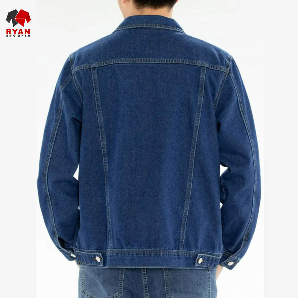 แจ็คเก็ตยีนส์คุณภาพพรีเมียมแบบสั่งทำพิเศษสำหรับผู้ชาย ยี่ห้อ Ryan Pro Gear ปิดด้วยกระดุม พร้อมโลโก้สั่งทำ