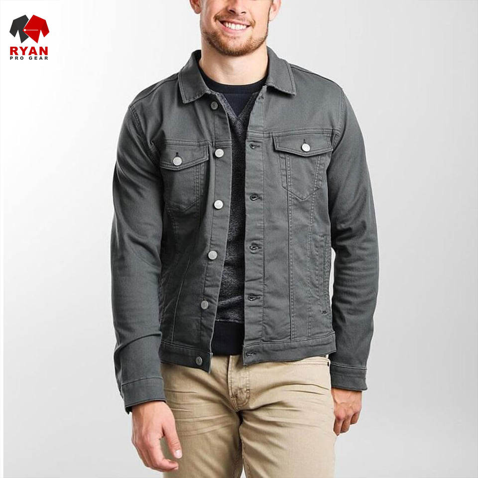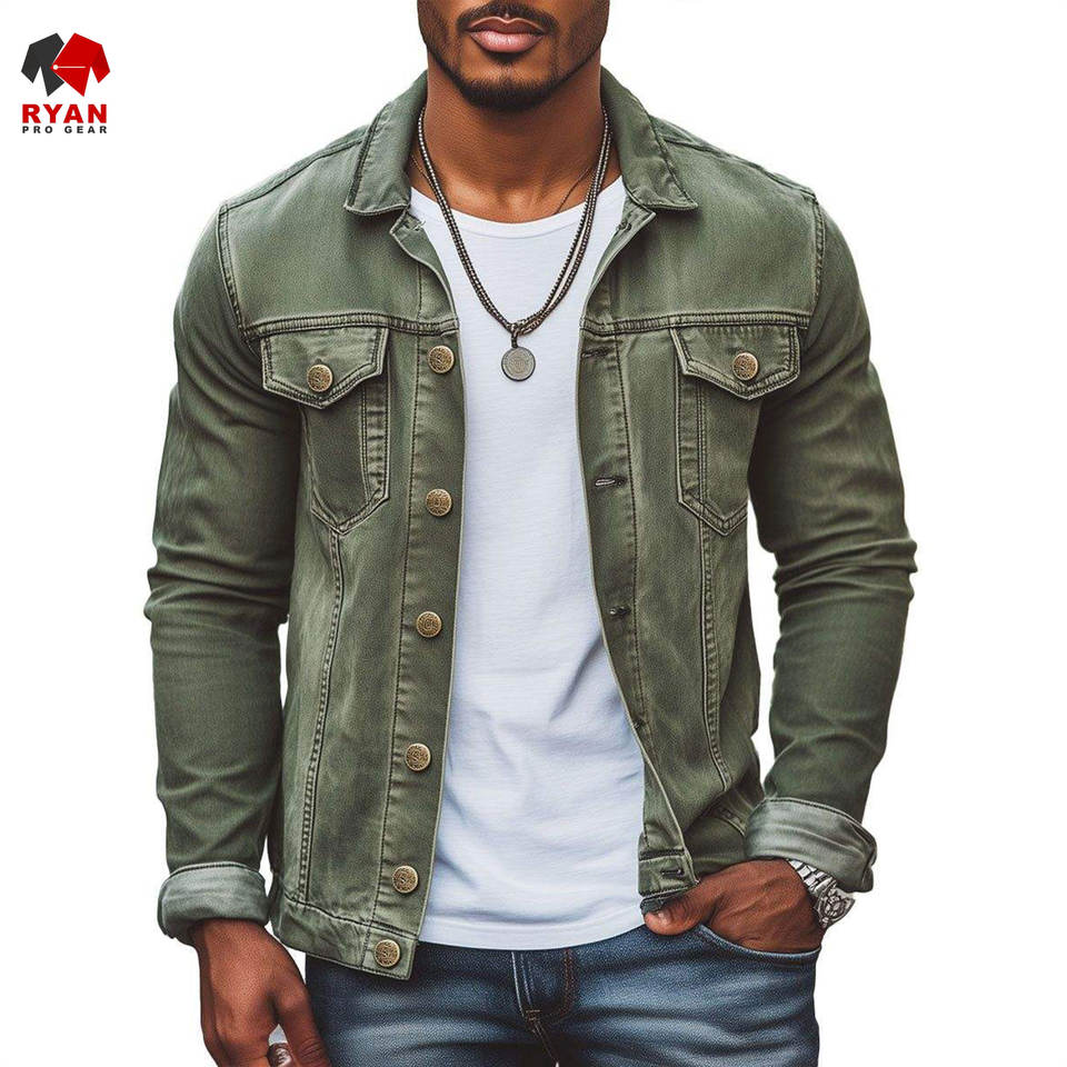 แจ็คเก็ตยีนส์คุณภาพพรีเมียมแบบสั่งทำพิเศษสำหรับผู้ชาย ยี่ห้อ Ryan Pro Gear ปิดด้วยกระดุม บุด้วยผ้าควิลท์ แห้งเร็ว พร้อมโลโก้แบบกำหนดเอง ดีไซน์ ODM