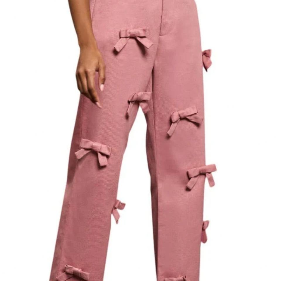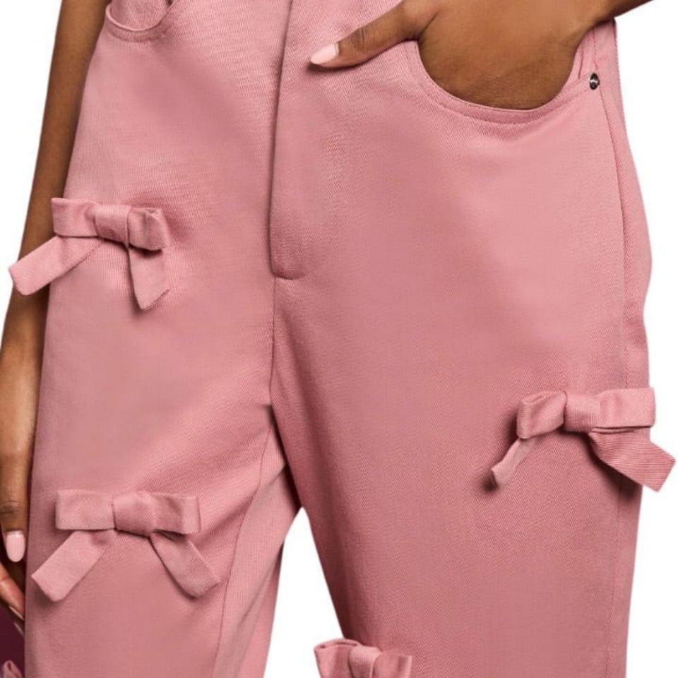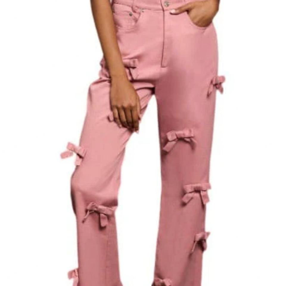 กางเกงยีนส์เดนิมสีชมพูปักโลโก้ S&L พร้อมดีเทลโบว์/ กางเกงยีนส์ริบบิ้นผู้หญิงสไตล์ Y2k ขอบยีนส์ยังไม่เย็บ ผลิตจากโรงงาน