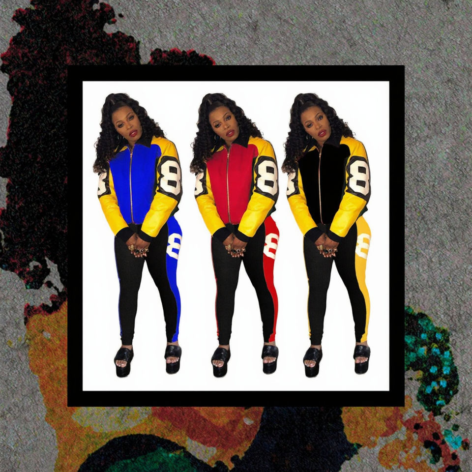 S-XXXL Eco-Friendly Printed Fall Color Block 8 Ball Matching Women's Short Sleeve Jacket and Pants Sets