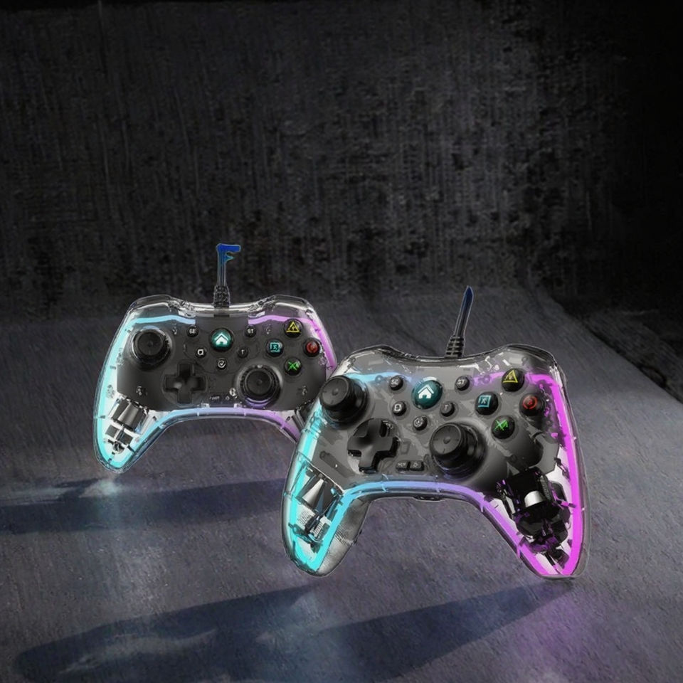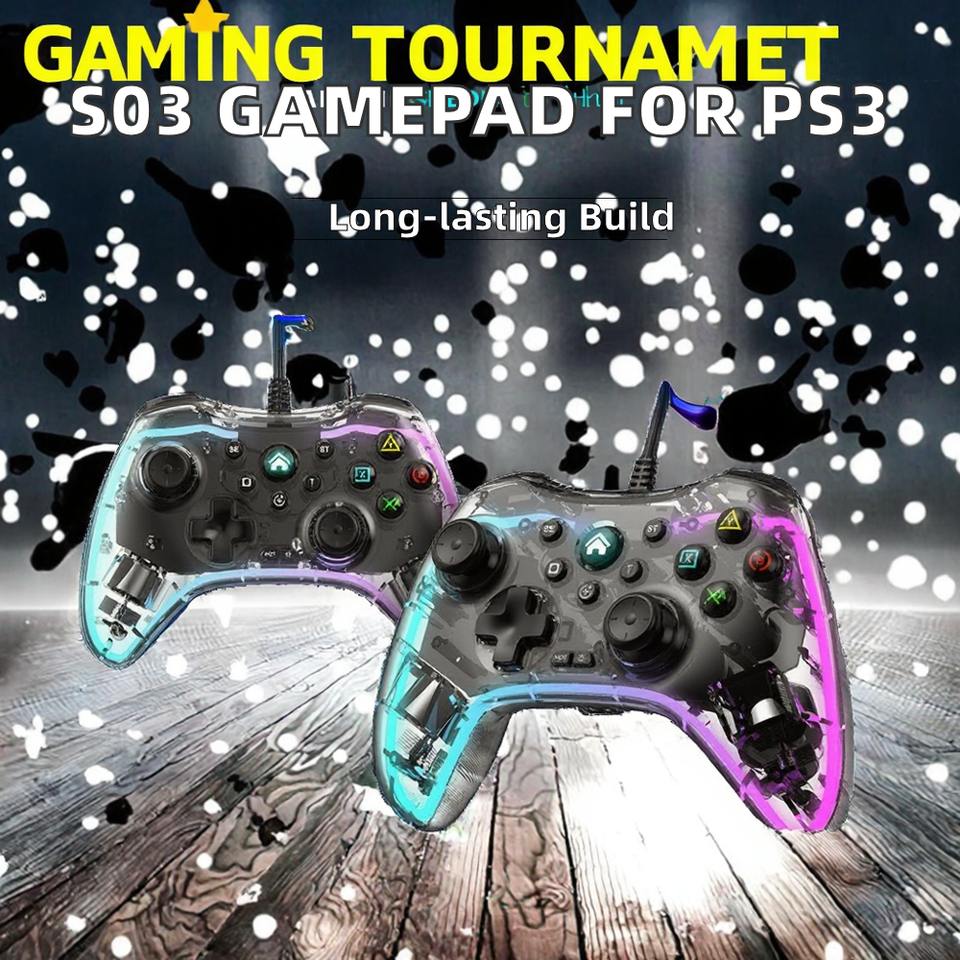 จอยเกมแบบมีสาย S03 สำหรับ P4 Android TV และ PC พร้อมมอเตอร์สั่นคู่ ไฟ RGB ไจโรสโคปนาโน คุณสมบัติพวงมาลัย