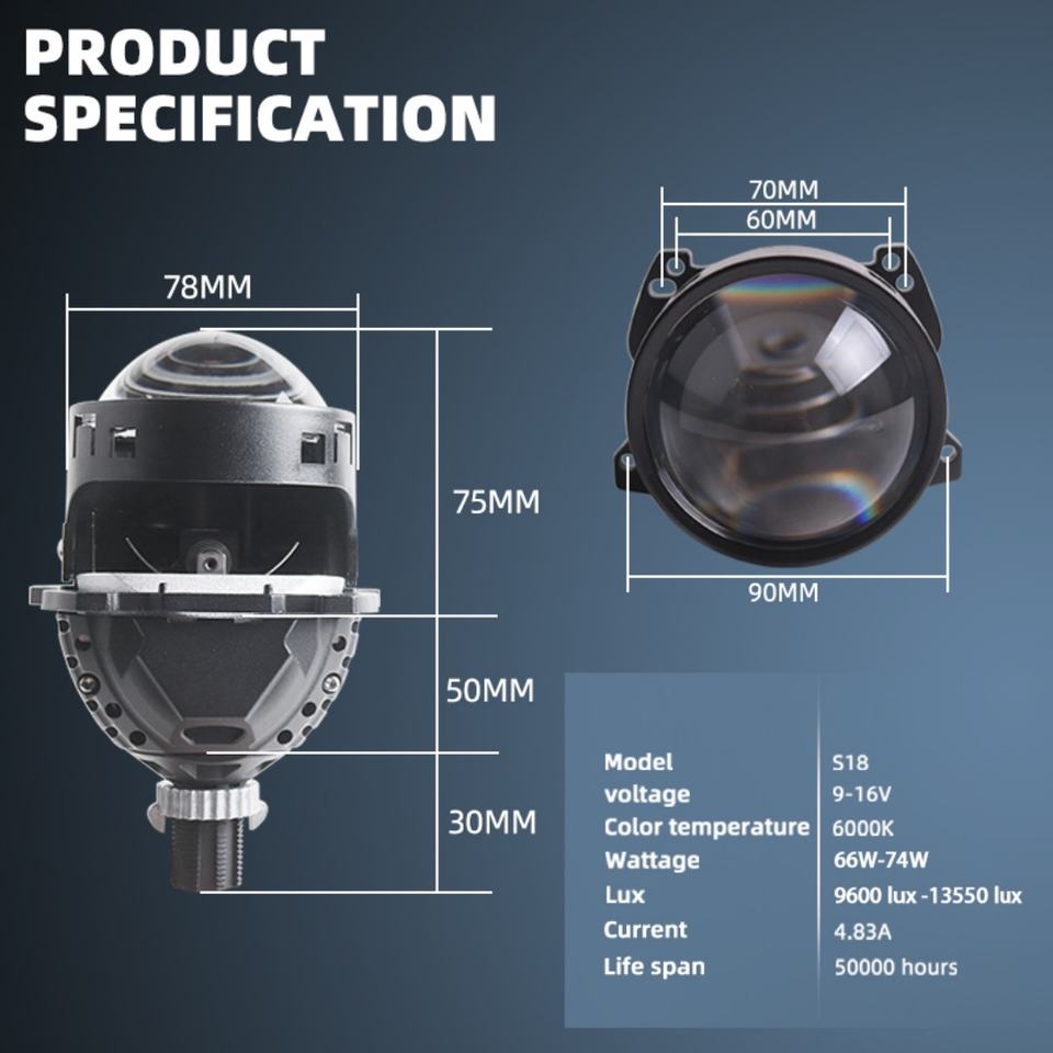 โปรเจคเตอร์ไฟหน้าแบบ Bi-LED รุ่น S18 Lossless กำลังไฟ 74w พร้อมเลนส์แบบ Dual Reflector ขนาด 3.0 นิ้ว อุปกรณ์ตกแต่งรถยนต์