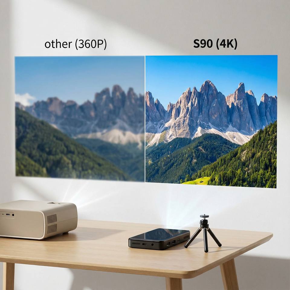 S90โปรเจคเตอร์ขนาดเล็กแบบพกพา3D 4K DLP Full HD 5G WIFI แบตเตอรี่โยนสั้น32GB 30000 Hours