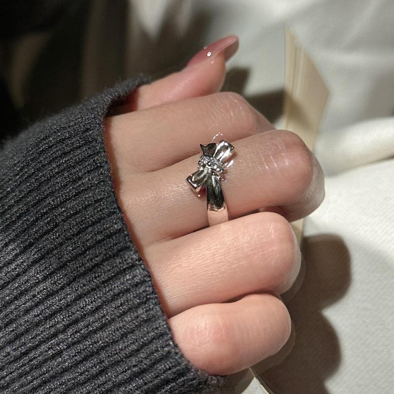 แหวนโบว์เงินแท้ S925 ดีไซน์เฉพาะตัว ชุบ 18K เครื่องประดับที่เบาและมีสไตล์ พร้อมฝังเพทายสุดหวานและเท่