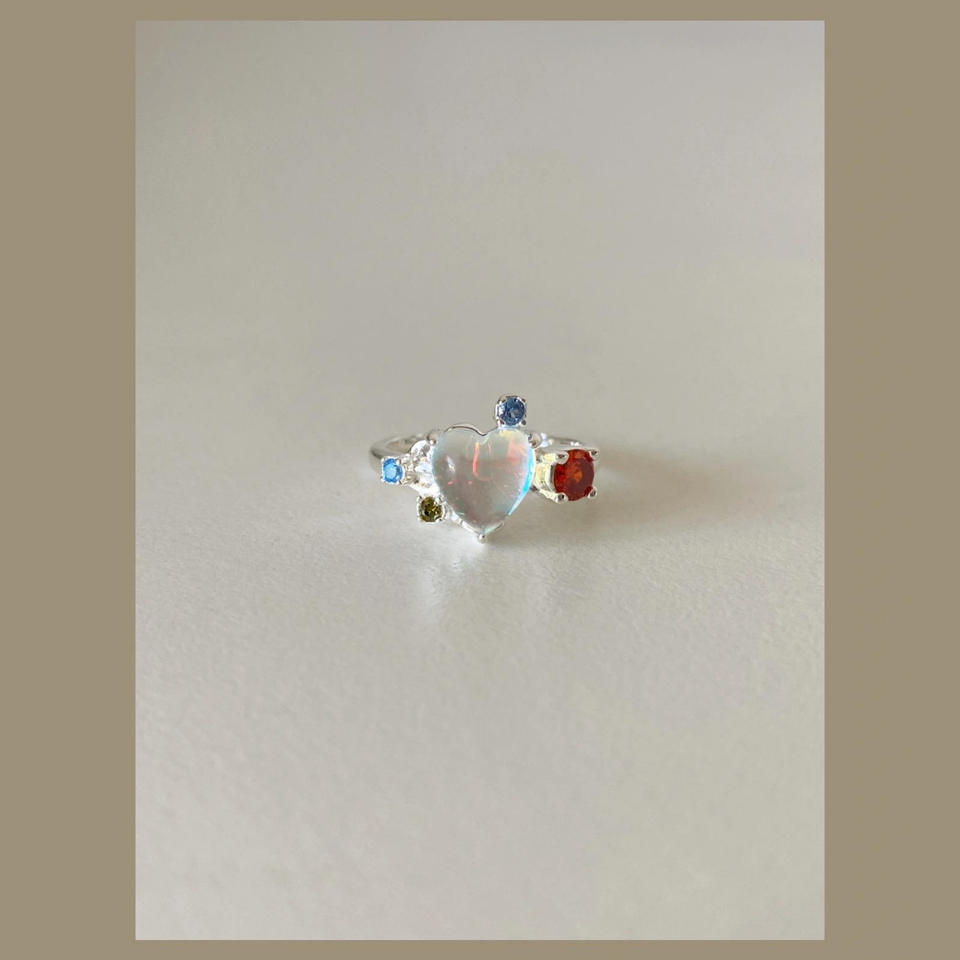 แหวนเงินแท้ S925 ประดับเพทายสีโอปอลและมูนสโตน รูปหัวใจ สำหรับผู้หญิง ดีไซน์โรแมนติก ชุบทอง 18K แบบเปิด คอลเลคชั่นพิเศษ