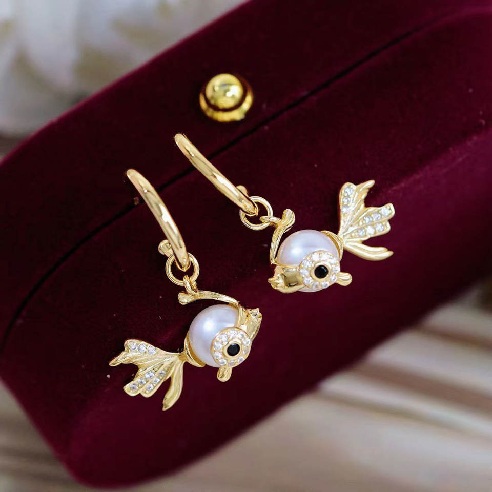 ชุดอุปกรณ์ทำเครื่องประดับมุก DIY เงินแท้ S925 แบบเปล่า รูปทรงปลาทอง รุ่น 9339 จี้และต่างหูเงินชุบทอง