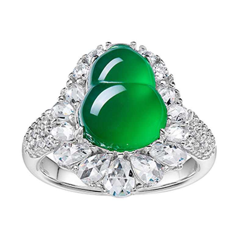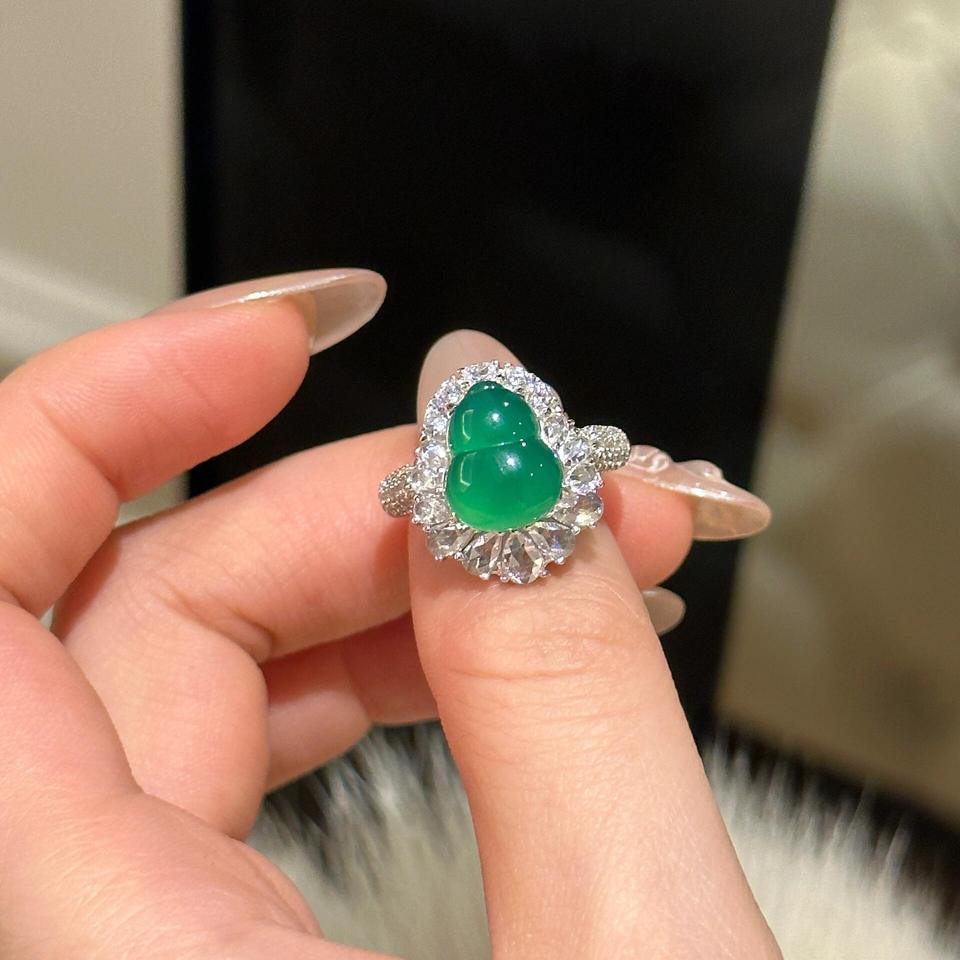 S925 Pure Silver Inlaid Full Diamond Green Chalcedony Gourd Ring Romantic Chinese Style Fulu Diamond Ring New Style