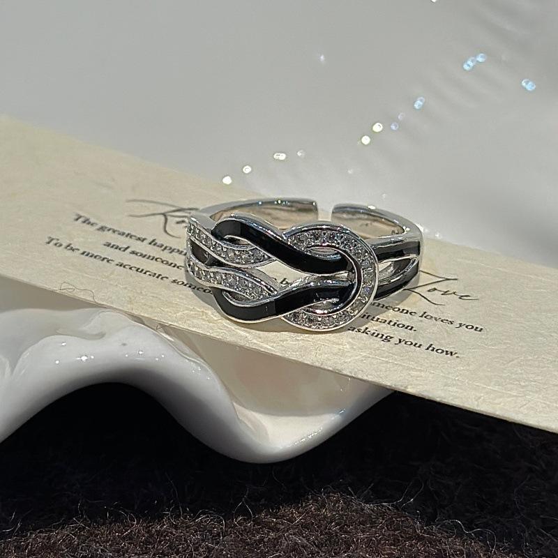 S925 Pure Silver Knotted Ring with Vintage Micro Zircon Inlay Niche Design Rose Gold Rhodium Plated Open Ring Black Drop Glaze