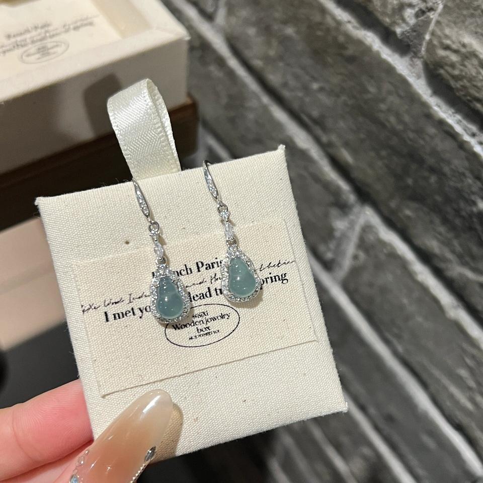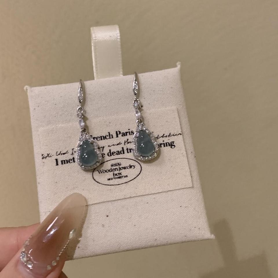 ต่างหูเงินแท้ S925 หยกน้ำสีฟ้าธรรมชาติ รูปทรงน้ำเต้า สไตล์จีน ดีไซน์สวยงาม พร้อมสีฟ้าอมเขียว